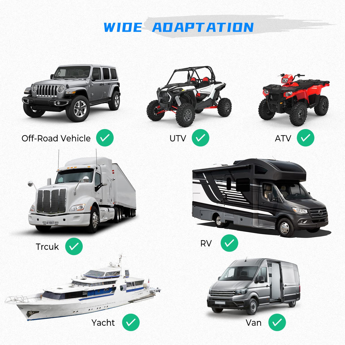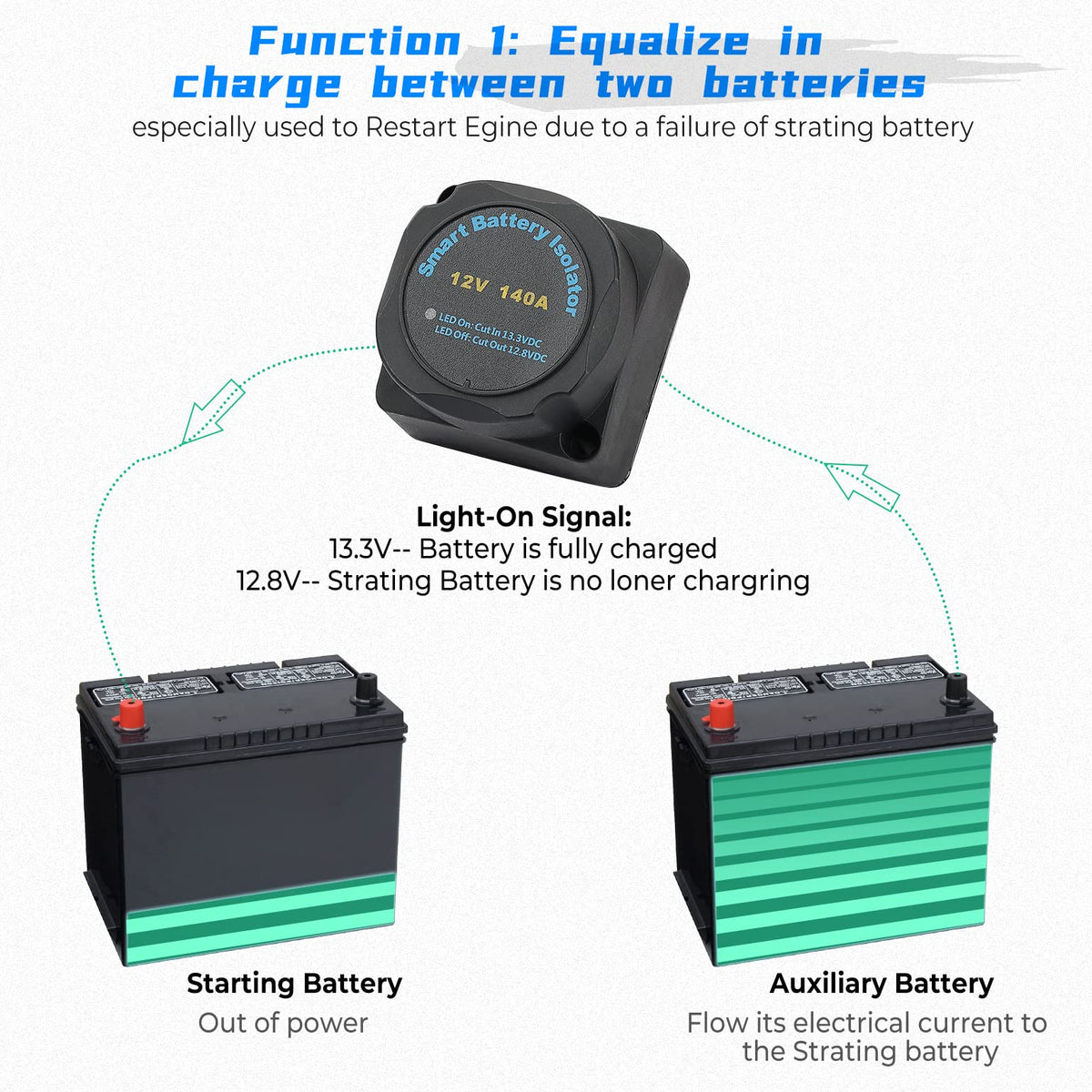 ?Wide Compatibility?Kemimoto Battery Isolator Kit is perfectly suitable for those vehicles with dual batteries. It is ultra-small and enjoys wide compatibility, including ATVs, Boats, RVs, trucks, camper vans, marine, and other vehicles. It is also compatible with UTV, including Ranger, General, Pioneer, Talon, Can-am, etc. *Reminder* We assume you have purchased a suitable second battery and mounted it near the start battery on your vehicle. | ?Two Separate Power Sources?The 12V 140Amp Dual Battery Isolator separates two batteries from one another to provide power independently--Starting Battery for the engine to start the car and Auxiliary Battery for additional electrical parts such as lights, air conditioner, etc. | ?Smart Charging Function?More importantly, the isolator is smart-charging and equalizes in charge between two batteries. It will prioritize charging to the starting battery, which avoids a failure of the starting battery. Once the starting battery is full, reaching 13.3V, the isolator will allow power to flow to the auxiliary battery. However, the isolator will cut off the current when the starting battery drops to 12.8V. | ?Perfect Kit with Useful Accessories?This kit is equipped with necessary accessories that can perfectly serve the isolator system. It includes a Smart Battery Isolator and other accessories including a Digital Double Voltmeter -- Monitoring the state of battery voltage; a Relay--Opening and closing the circuits; 3 Marine Battery Terminal --Connecting a load or charger; 2 Red Cables L300mm; 1 Balck Ground Cable L600mm; 1 Green and Grey Cable L2350mm; 3 Female Spade Connectors and 10 Cable Ties. | ?Easy Installation?This 12V dual Battery Isolator is featured with waterproof, dustproof, and vibration-proof construction. This kit is an easy installation with complete and convenient accessories, providing reliable and efficient performance for your vehicle or boat. *Reminder* Our supplied accessories may be not enough due to your actual situation. You need to provide extra hardware by yourself to complete the installation.