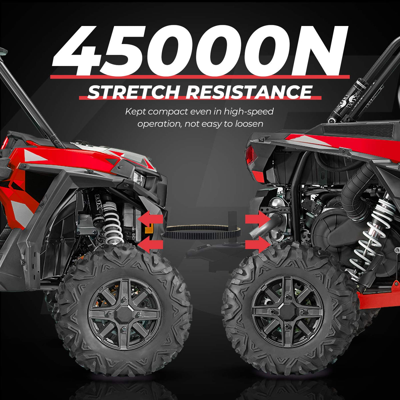 ?Strong heat dissipation? KEMIMOTO 2015 1000 XP drive belt is made of high-quality chloroprene rubber and aramid string cord for better heat resistance and heat dissipation. Withstand the friction of high-speed operation without melting. Work well in high temperatures. | ?45000N stretch resistance?-45000N tensile strength carbon drive belt. Keep high compact even in high-speed operation and not easy to lose. Provide you with the performance and durability you need even under the most demanding conditions. Upgrade your UTV. | ?Durable three-layer-thick?-Three-tier design: High-temperature resistant High-strength thick rubber, Stretch-resistant aramid yarn. Make the KEMIMOTOdrive belt strong and sturdy. Effectively improve service life. | ?Precise tooth pitch design and Uniform wear ?-The tooth surface of the General XP drive belt is made of dipped nylon elastic cloth. Precise tooth pitch design, ensure uniform force, and effectively Reduced Speed Loss. The precise occlusal spacing design can ensure that the 1000 belt is evenly stressed during the transmission. Reduce unilateral wear and extend the life of the drive belt. | ?Compatible with Polaris RZR XP 1000 and XP 4 1000 General 1000 XP?- The KEMIMOTO 1000 XP drive belt is compatible with the Polaris RZR XP 1000 for the years 2015, 2016, 2017, 2018, 2019, 2020, 2021, 2022, and 2023. It is also compatible with the XP 4 1000 General 1000 XP from 2020 to 2022. This belt replaces OEM Part Numbers: 3211180, 3211196, 3211172, 3211149, 3211148, and 3211142.