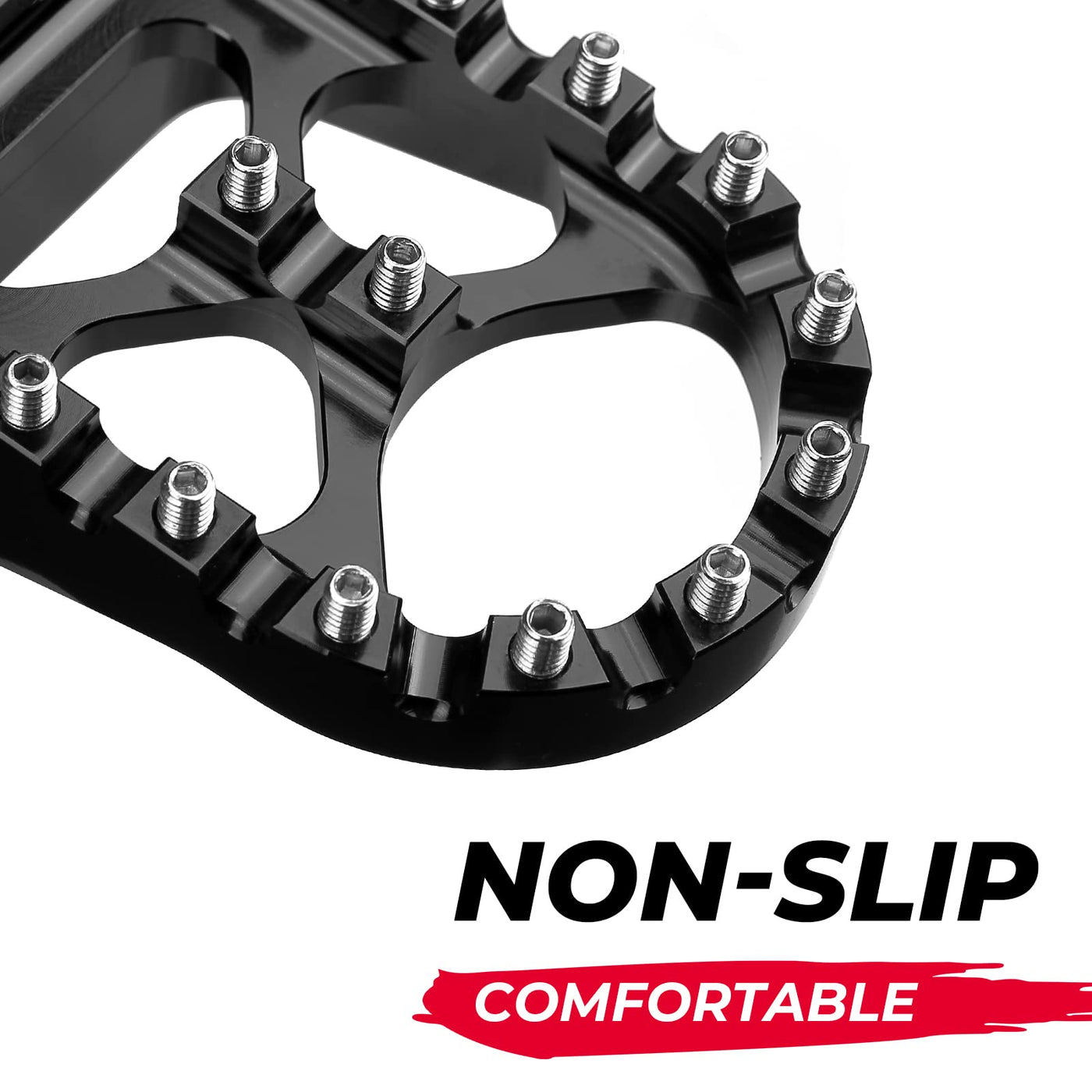Q: Do the foot pegs provide good grip during riding?A: Yes, the foot pegs feature non-slip teeth made of replaceable stainless steel, providing excellent grip to keep your boots planted securely even in wet conditions.