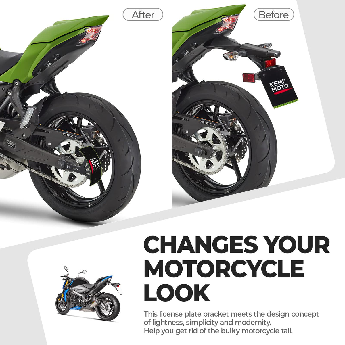 Q: What is the design advantage of the KEMIMOTO Motorcycle License Plate Holder?A: The arm thinning design of this license plate holder provides a better fit with your motorcycle, enhancing both aesthetics and functionality. This ensures that the license plate sits snugly against your bike.