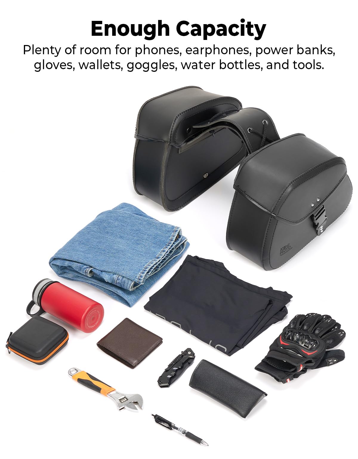 ?Wide Suitability for Motorcycle?Universal motorcycle saddlebags is fit for most motorcycle models. Including but not limited to Sportster, Softail, Dyna, Road King, V-star, and Shadow(PS: Please make sure the 1-inch clearance between the saddlebags and exhaust pipe). ?Enough Capacity for Daily Needed?Saddlebags for motorcycles size is 11.6 *4.5 *9.8 inches. Enough room to store some regular stuff. Such as Cups, Drinks, Gloves, Wallets, Earphones, Power Banks, Raincoats, Tools, or other daily necessities to meet your demands for commuting and short vacations. ?Waterproof & Keep Shape?Motorcycle saddlebags are made of high-quality PVC leather for excellent waterproofing and stability. Tight stitching and flap design allow them to support the weight of your items well and will not lose luggage during driving. Always stay as it is even with just a little something empty. ?Easy to Installation & Adjustment?Saddlebags for motorcycles come with a cord used to fasten the saddlebags together, tie two saddlebags together with ropes, then you can install them under the rear seat mount of your motorcycle, and adjust the distance between two motorcycle saddlebags through the ropes. ?Easy to Use & Why Choose Us?Flap design for saddlebags to help to keep some rain out or dusty and keep stuff dry and clean, At KEMIMOTO, we fully stand behind our motorcycle saddlebags. If you don't 100% love our motorcycle saddlebags, please don't hesitate to contact us, and we will provide you with the best solution in time.