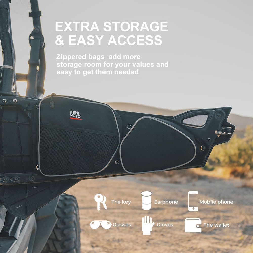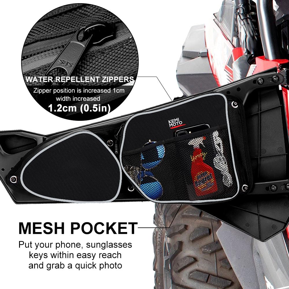 1680D fabric: We used 1680D polyester material to ensure that your new kemimoto rzr door bags would stand up to anything you put it through. 1680D is durable and long lasting REINFORCED fabric. - See Video for Instruction | Sponge knee pad: The knee pad is thick and confortable to protect your knees, and these rzr 1000 door bags adds storage for your UTV | Material: We use the PVC materials to make the door bag for rzr and the water repellent zippers sturdy enough. These kemimot door bags are water-resistant | Fit vehicle: These rzr front door bags will compatible with 14-21 RZR XP4 1000, 14-21 XP1000, 15-21 RZR 900 (60'' wide models), 2014-21 RZR Turbo. DOES NOT FIT 2017 RZR 900 XC and 2017 General and Standard RZR 900. Some 2018 models have change the door holes, so you may need to drill additional holes to install the door bags | Extra Storage Space: Each bag provides 3.5L extrea space. Sold as a pair, one for left front door, the other for right front door