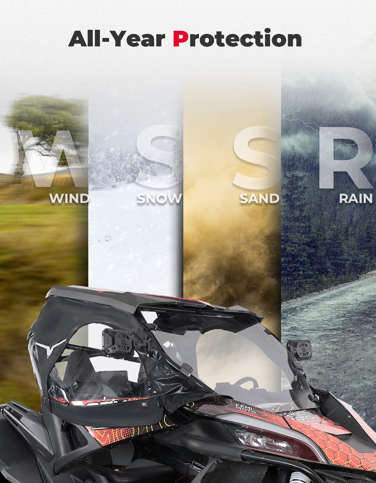 Q: Are the KEMIMOTO Upper Doors weather-resistant?A: Yes, the KEMIMOTO Upper Doors are made from ultra-soft PVC material that provides excellent protection against wind, leaves, and rain, ensuring that the interior of your UTV remains dry and comfortable during rides.