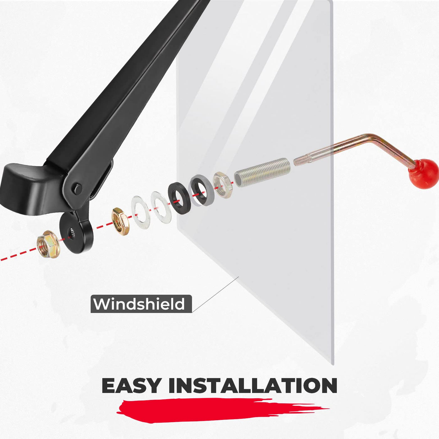 Q: How do I install the KEMIMOTO Windshield Wiper on my UTV?A: To install the KEMIMOTO Windshield Wiper, you will need to drill a 1/2" hole in your windshield for mounting. Once the hole is made, follow the included instructions to attach the wiper assembly securely. It is designed to fit hard-coated polycarbonate or glass windshields.