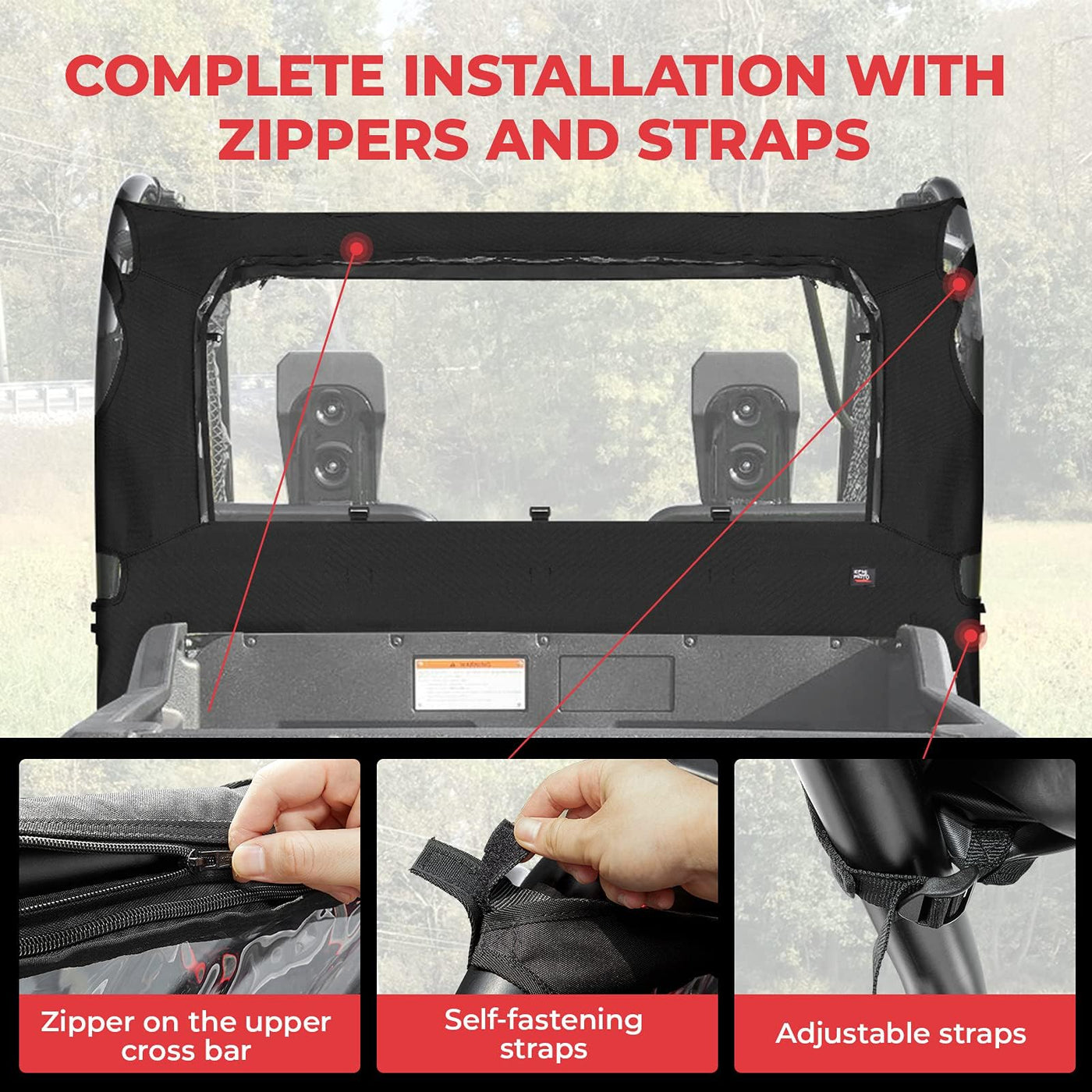 Q: How easy is it to install the KEMIMOTO rear panel on my UTV?A: The installation of the KEMIMOTO rear panel is designed to be tool-free and straightforward. You can easily wrap it over the rear frame of your UTV and secure it using straps and a zipper, typically taking just a short time to complete.