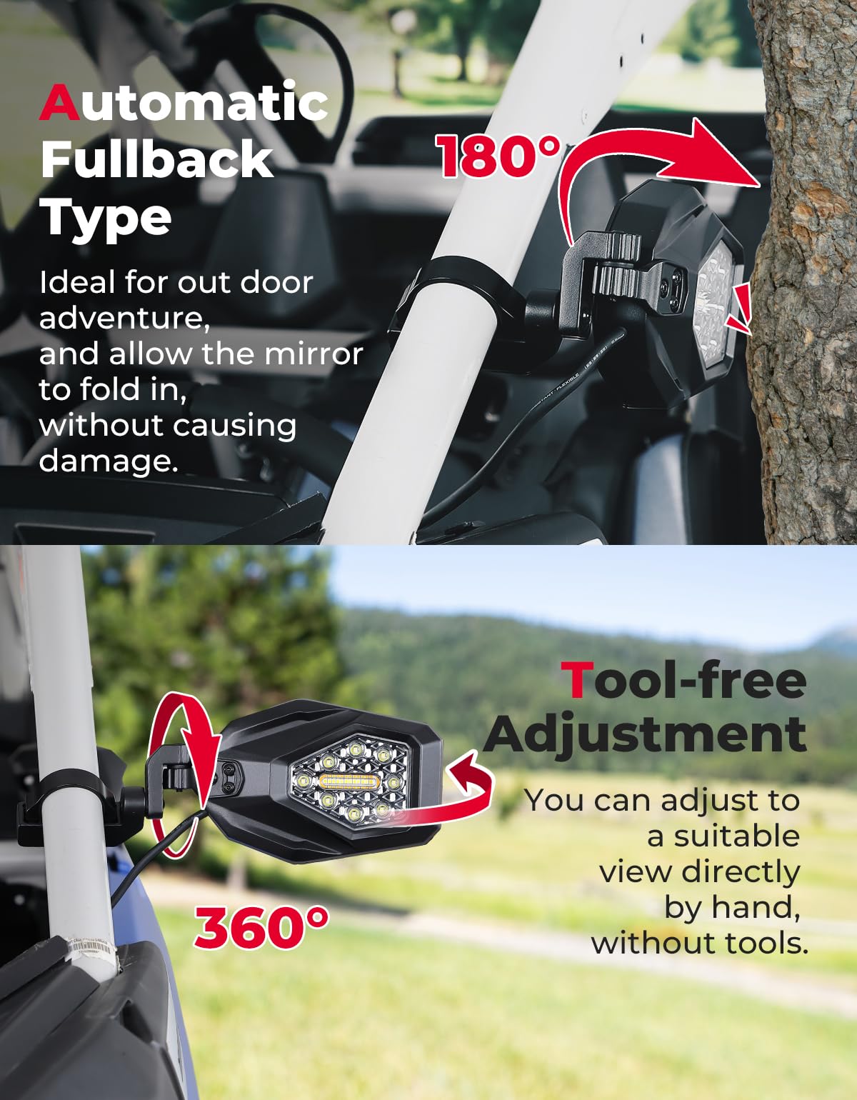 The Kemimoto UTV Side Mirrors with Turn Signal and Spotlight, the perfect addition to your off-road vehicle for enhanced safety and visibility. These mirrors feature amber flowing turn signals and high-intensity spotlights, providing added safety for drivers compared to regular mirrors. With the ability to greatly improve visibility in low-light conditions, you can confidently take on any adventure. Our led lighted mirrors have two adjustable functions, allowing for 180 horizontal rotation and 360 vertical rotation, ensuring the best possible viewing angle. Plus, when hitting an obstacle, they can be quickly folded to prevent damage to the mirror. The special clamp design makes these mirrors compatible with windshields, and they fit 1.6''-2'' roll bars, compatible with Polaris RZR all models (except 170), Pioneer 1000 Talon, Can Am Maverick Commander (Just Round Roll Bar), Kawasaki Teryx, and more. Installation is a breeze with just two simple steps and a few minutes, without the need for rubber pads. The non-slip clamp design ensures the mirrors remain stable even at high speeds, preventing shaking or slipping. Made of impact-resistant aluminum material and shatterproof glass, these mirrors are durable and suitable for all weather conditions. Even in the event of an accident, the mirrors will not shatter and cause flying debris.