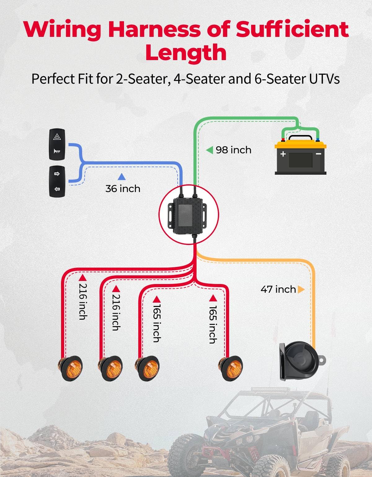 Introducing our STREET LEGAL TURN SIGNAL KIT - the perfect addition to your ATV, UTV or SXS. Our universal turn signal set is compatible with Polaris RZR RANGER, Pioneer, Talon, Can-Am, Kawasaki, Arctic Cat and more. Featuring amber lights, the most penetrating light in the spectrum, our utv turn signal kit ensures your vehicle is visible from a long distance, even in rainy and foggy weather. This helps other vehicles to notice your presence, creating vigilance and improving safety awareness. Our utv blinker kit also includes a 110DB horn, which alerts nearby vehicles and pedestrians without alarming them suddenly. With short and long press capabilities, the horn is easy to use and won't startle anyone around you. The electric horn kit is designed with a button that matches the rocker switch, flexible switch, rocker switch, press and automatically up, laser etching LED switch, and eliminates the need to grope around in the dark. Installation is a breeze with our plug and play design, featuring prewired harness plugs onto the rocker switch. Simply connect to your vehicle and you're ready to go. Our upgraded wire harness length accommodates both 2-seater and 4-seater vehicles up to 150 inches long. Color lines are marked on the corresponding installation location, improving your installation efficiency.