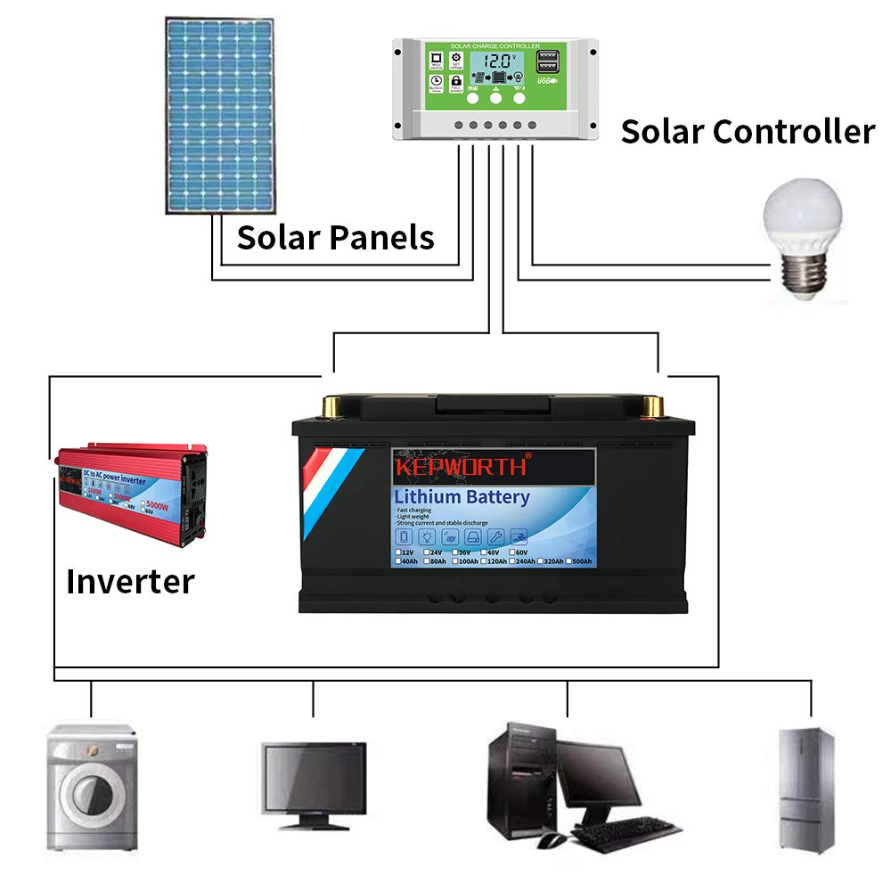 Q: What applications are suitable for the KEPWORTH 12V 100Ah LiFePO4 battery?A: This battery is versatile and can be used for a variety of applications, including power stations for camping, RVs, marine environments, golf carts, medical devices, motorhomes, and electric mobility scooters, as well as off-road and off-grid situations.