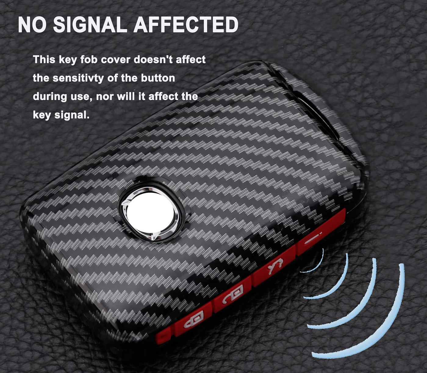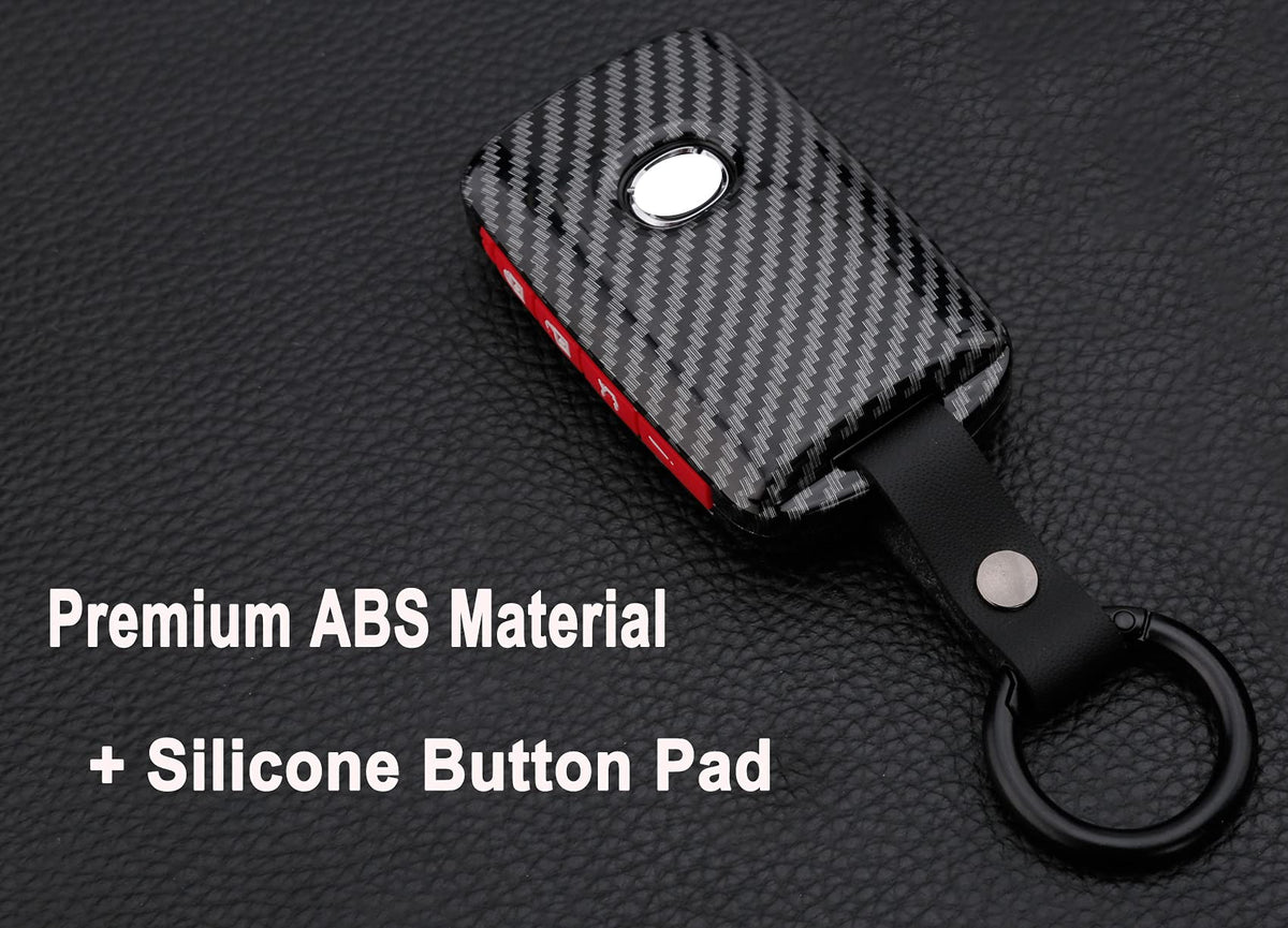 Q: What materials are used in the construction of this key fob cover?A: The key fob cover is made from high-quality ABS plastic and silicone rubber, ensuring durability and a premium feel. The carbon fiber pattern adds a stylish touch while providing 360-degree protection for your key fob.
