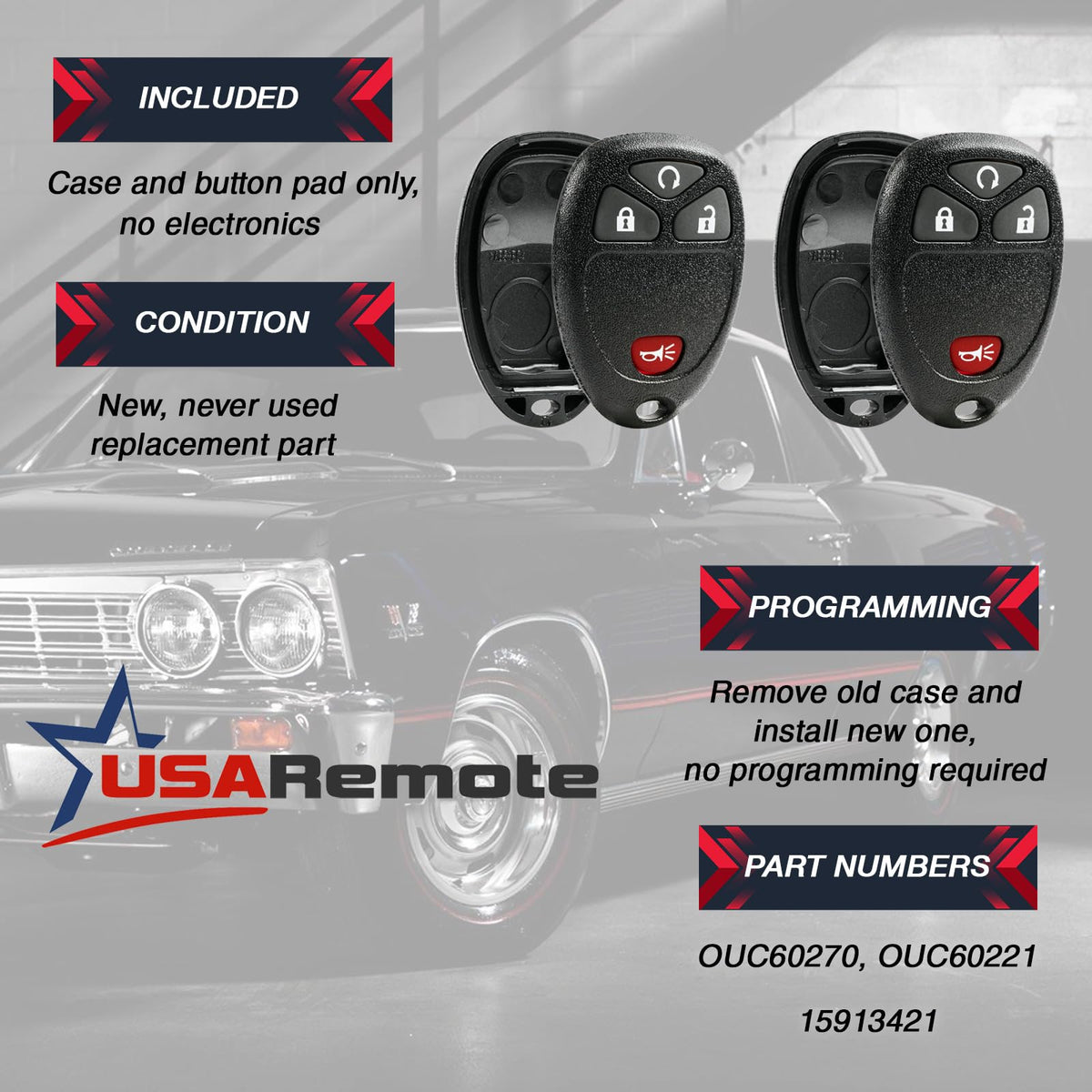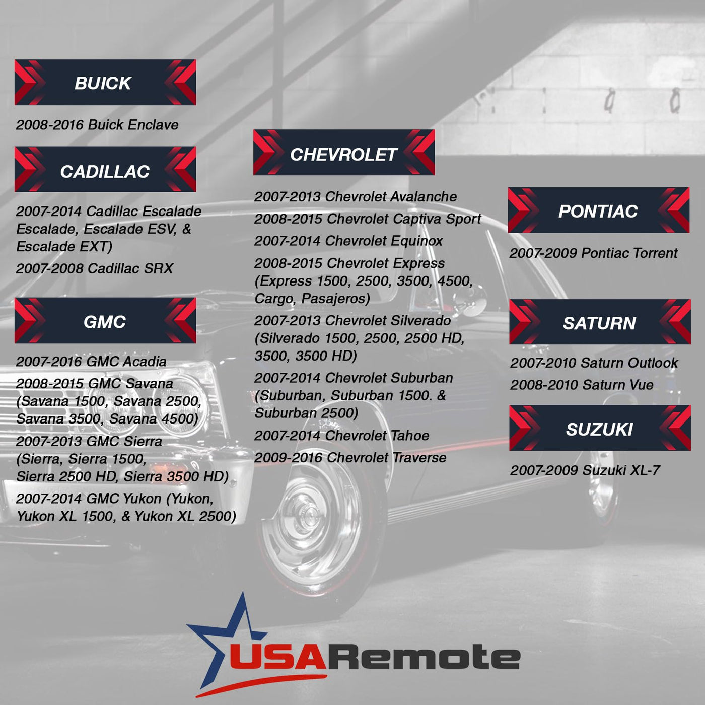 Replace your lost or broken keyless entry key fob remote with a USARemote Fob.Fits P/N: 15913421, OUC60270, OUC602212008-2016 Buick Enclave2007-2014 Cadillac Escalade2007-2008 Cadillac SRX2007-2013 Chevrolet Avalanche2008-2015 Chevrolet Captiva Sport2007-2014 Chevrolet Equinox2008-2015 Chevrolet Express2007-2013 Chevrolet Silverado2007-2014 Chevrolet Suburban2007-2014 Chevrolet Tahoe2009-2016 Chevrolet Traverse2007-2016 GMC Acadia2008-2015 GMC Savana2007-2013 GMC Sierra2007-2014 GMC Yukon2007-2009 Pontiac Torrent2007-2010 Saturn Outlook2008-2010 Saturn Vue2007-2009 Suzuki XL-7This is a replacement aftermarket part.