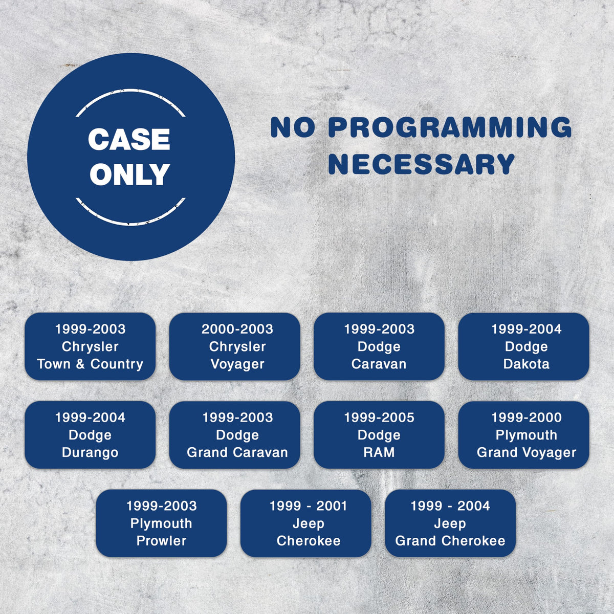 A quick, easy and affordable way to replace a cracked or worn out keyless entry remote key fob case or shell. Replace the outer case or shell instead of the entire assembly with this product. Installation is simple and reprogramming is not required. No electronics or circuit board are included. You must transfer over your original components into this case.