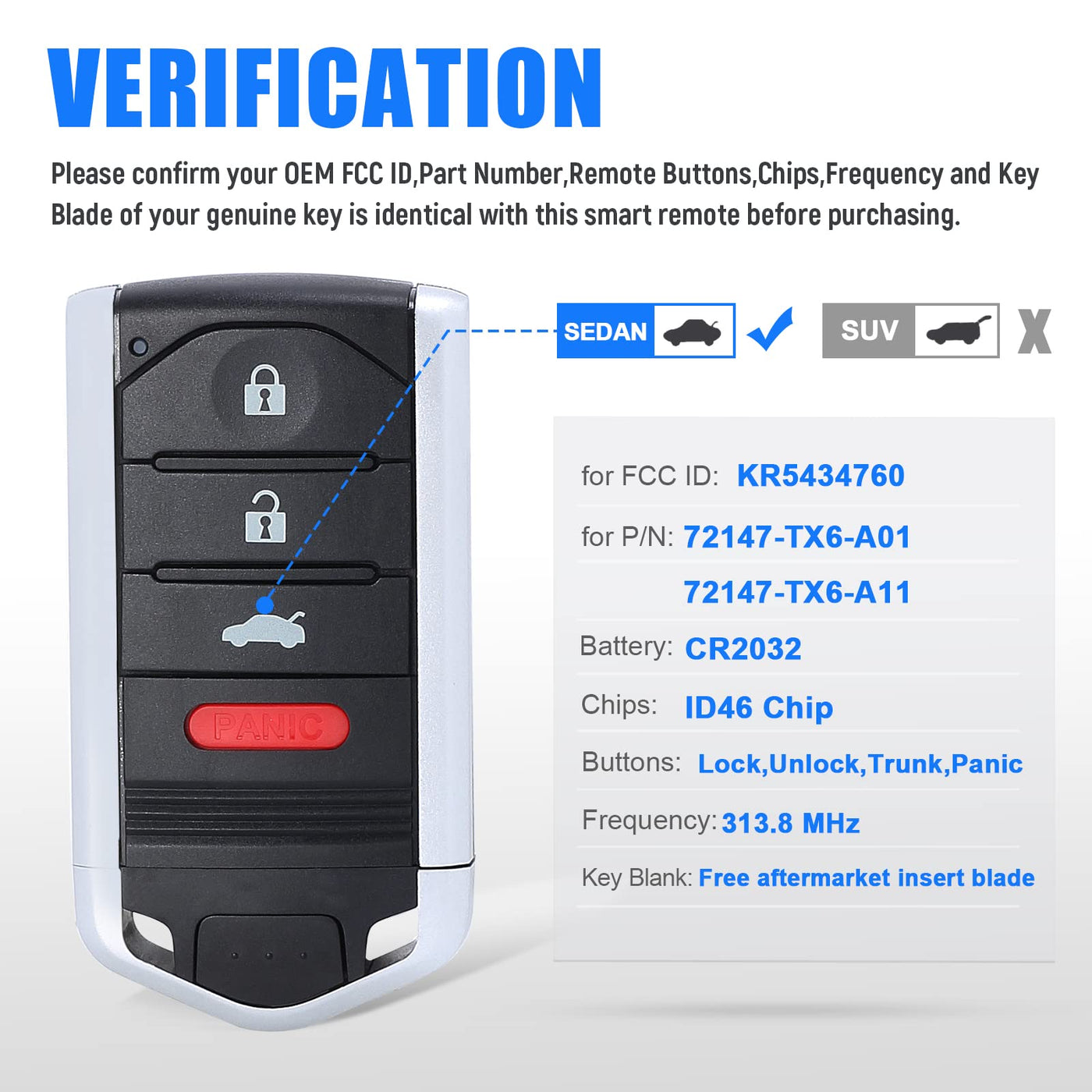 Keymall Car Key Fob Keyless Entry Remote Control For Acura Ilx 2013 2014(Fcc Id:Kr5434760 P/N:72147-Tx6-A01 72147-Tx6-A11) 4 Buttons