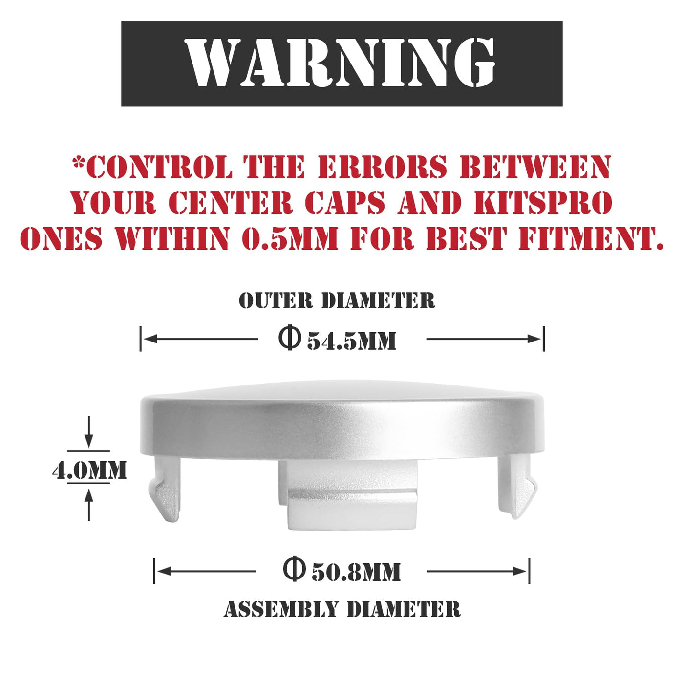 Q: How can I ensure the KitsPro wheel center caps fit my vehicle?A: To ensure the KitsPro wheel center caps fit your vehicle, measure the diameter of your wheel rim hole. The outer diameter should be 54.5mm ± 0.5mm, and the inner assembly diameter should be 50.8mm ± 0.5mm. If you're unsure, you can contact customer support for assistance.