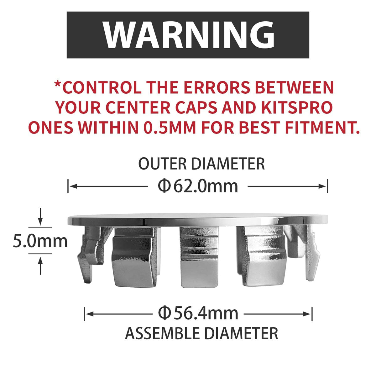 KitsPro wheel center caps are designed to replace the old, broken or missing caps with easy installation. All wheel center caps are made of heat and impact resistant materials which have been tested to insure a secure and reinforced fitment. Each set contains 4 pieces of wheel center caps. Please make sure that the size of the wheel center caps match yours. ||Product Parameter: 1).Outer Diameter: 2.4 inch 60mm; 2).Assembly Diameter: 2.2 inch 56mm; 3).Length of Clip: 0.1 inch 3mm.
