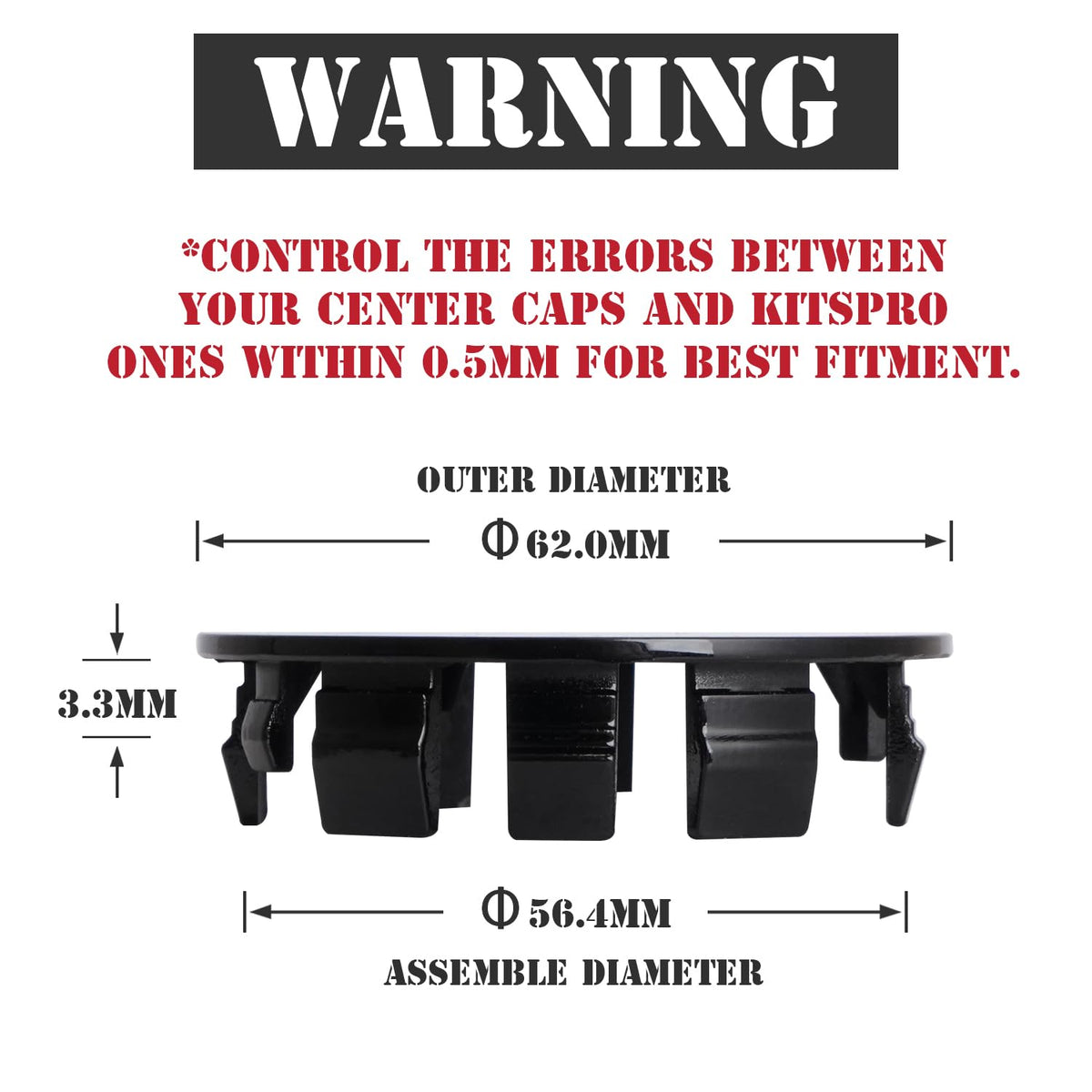 Q: What are the dimensions of the KitsPro wheel center caps?A: The KitsPro wheel center caps have an outer diameter of 62mm (2.4 inches) and an inner assembly diameter of 56mm (2.2 inches). It's important to measure your wheel rim hole to ensure compatibility.