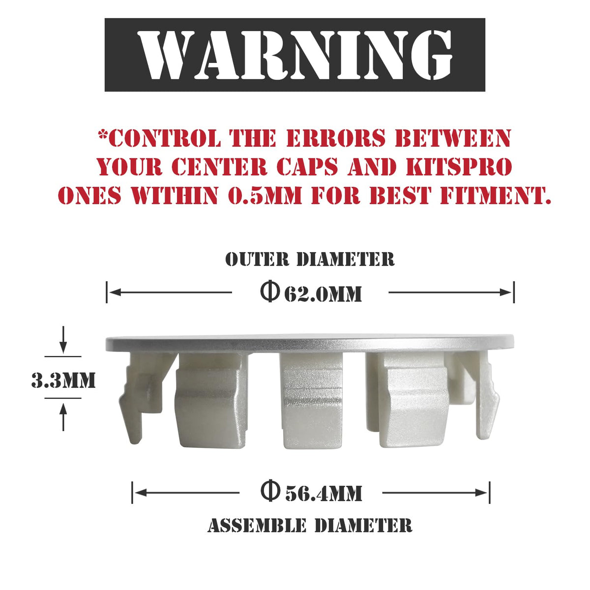 KitsPro wheel center caps are designed to replace the old, broken or missing caps with easy installation. All wheel center caps are made of heat and impact resistant materials which have been tested to insure a secure and reinforced fitment. Each set contains 4 pieces of wheel center caps. Please make sure that the size of the wheel center caps match yours. ||Product Parameter: 1).Outer Diameter: 2.4 inch 62mm; 2).Assembly Diameter: 2.2 inch 56mm; 3).Length of Clip: 0.2 inch 5mm.