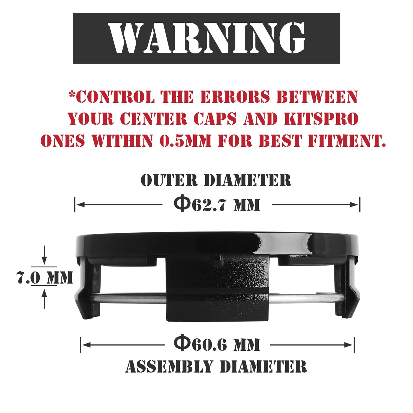 Q: How can I ensure the wheel center caps will fit my vehicle?A: To ensure a proper fit, measure the diameter of your wheel rim hole. The outer diameter of the KitsPro caps is 63mm, while the inner assembly diameter is 61mm. It's recommended to watch the instructional video or contact customer support for guidance if you're unsure.