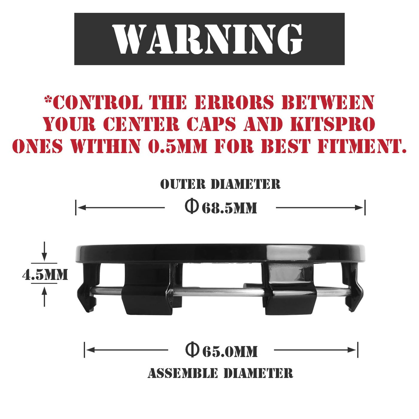 Q: How do I measure the wheel rim hole for proper fitting?A: To measure the wheel rim hole, use a caliper or a ruler to determine the diameter of the hole where the center cap will fit. Ensure that the outer diameter is approximately 68.5mm and the inner assembly diameter is around 65mm. If you are unsure, you can refer to measurement videos or contact us for assistance.