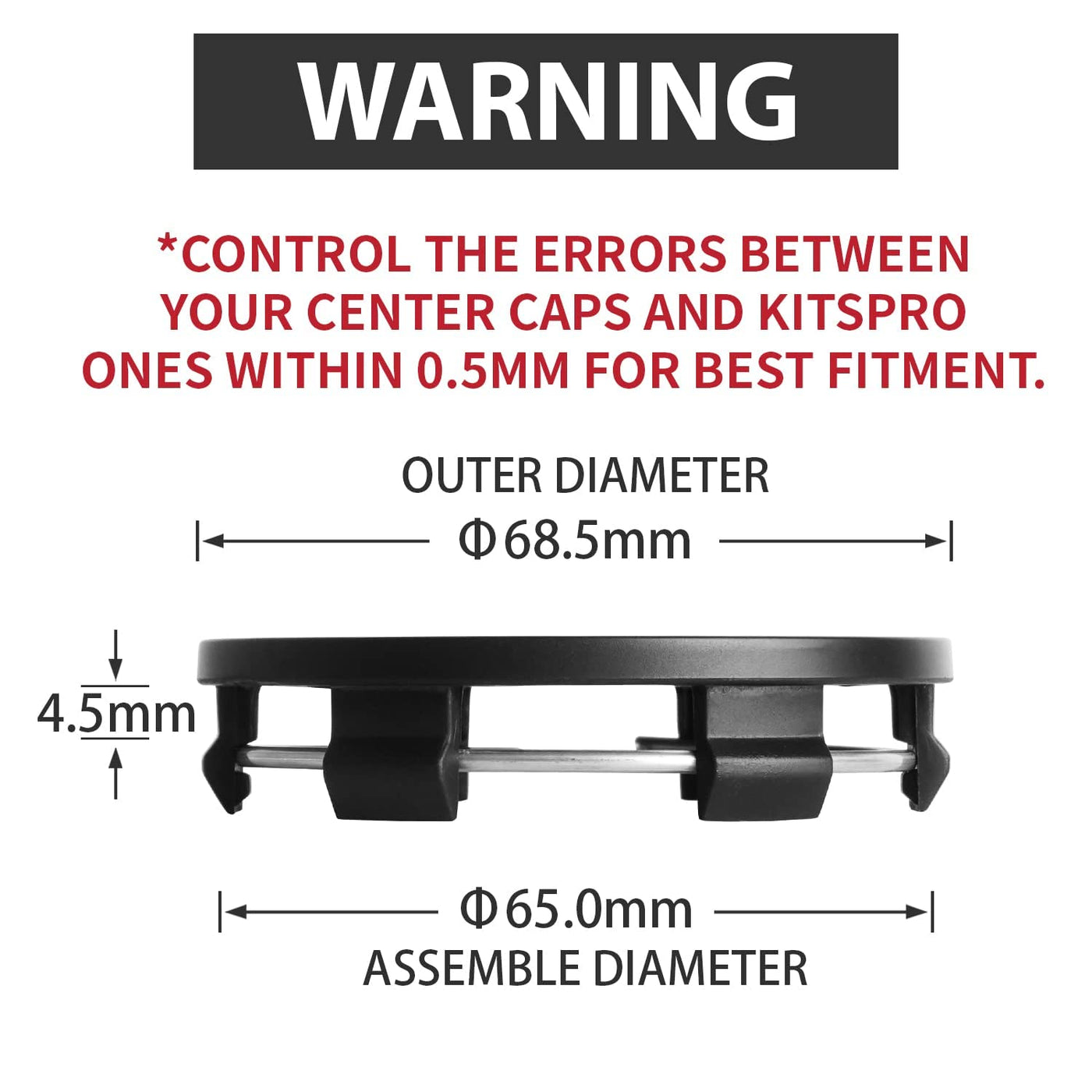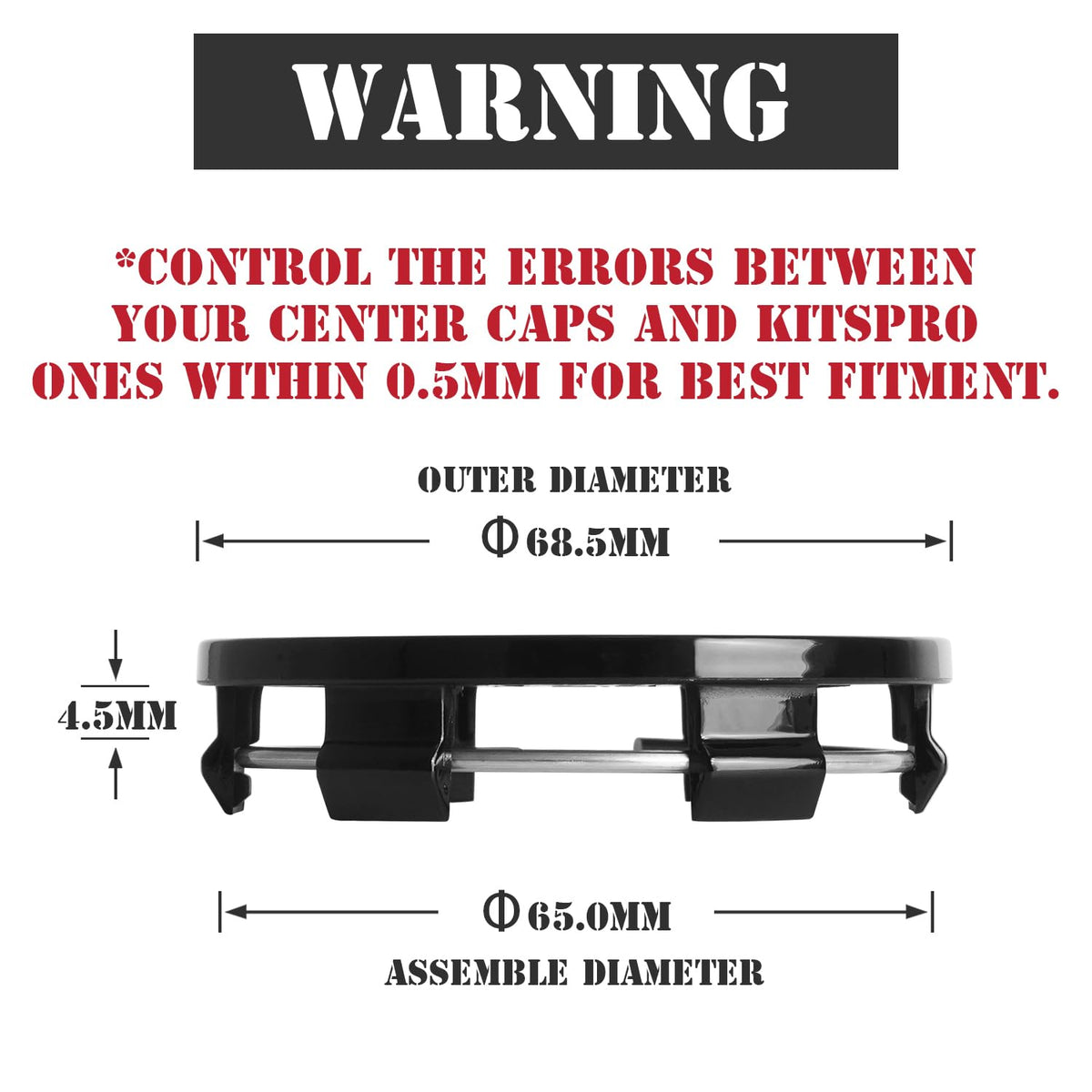 Q: How do I measure the size of my wheel rim hole to ensure a proper fit?A: To measure the size of your wheel rim hole, use a caliper or ruler to determine the diameter. The outer diameter of the KitsPro center caps is 68.5mm, while the inner diameter is 65mm. Make sure to measure accurately, and if you're unsure, consider watching instructional videos or contacting customer support for assistance.