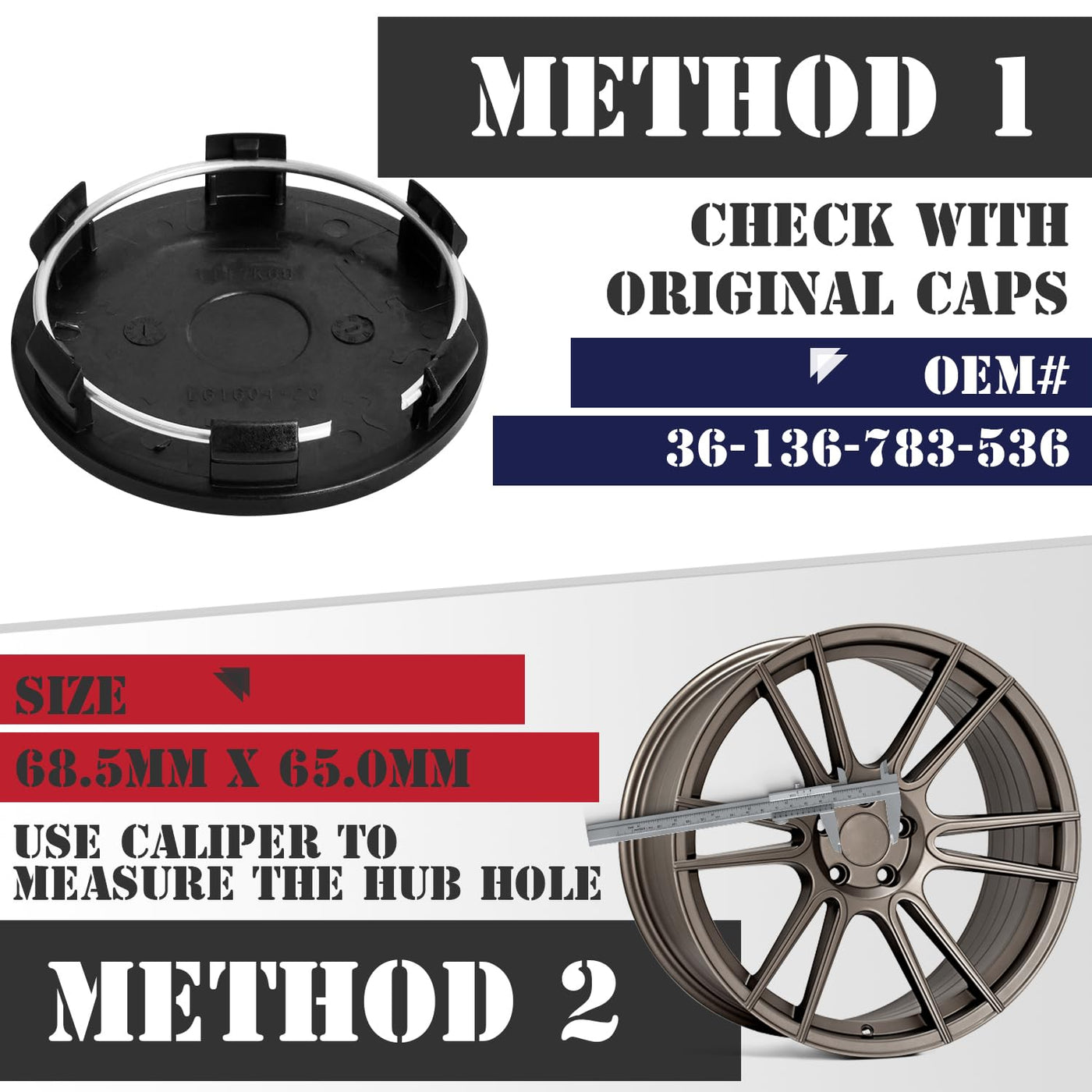 KitsPro wheel center caps are designed to replace the old, broken or missing caps with easy installation. All wheel center caps are made of heat and impact resistant materials which have been tested to insure a secure and reinforced fitment. Each set contains 4 pieces of wheel center caps. Please make sure that the compatibility and size of the wheel center caps match yours. ||Model Number: 36-136-783-536. ||Product Parameter: 1).Outer Diameter: 2.7 inch 68.5mm; 2).Assembly Diameter: 2.56 inch 65mm; 3).Length of Clip: 0.2 inch 4.5mm.