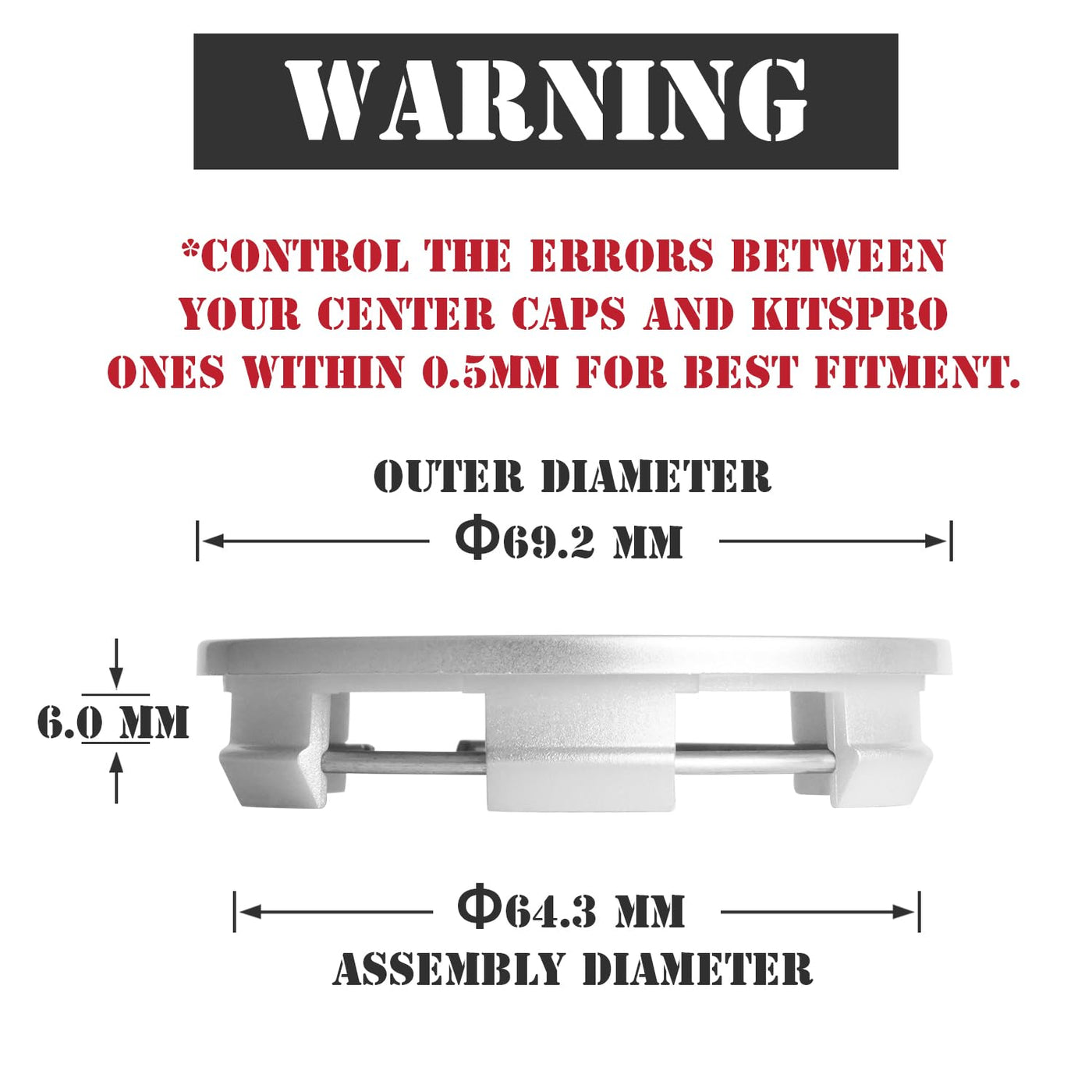 Q: How do I measure my wheel rim to ensure a proper fit?A: To measure your wheel rim, use a caliper or measuring tape to determine the outer diameter of the rim hole. For the KitsPro center caps, the outer diameter should be approximately 69.2MM and the inner assembly diameter around 64.3MM. If you need assistance, you can watch our instructional video or contact our support team.