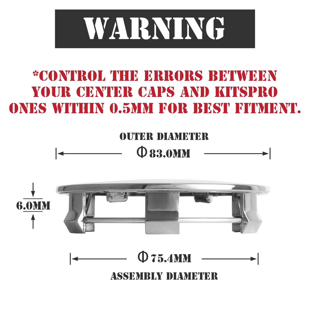 Kitspro Wheel Center Caps Are Designed To Replace The Old, Broken Or Missing Caps With Easy Installation. All Wheel Center Caps Are Made Of Heat And Impact Resistant Materials Which Have Been Tested To Insure A Secure And Reinforced Fitment. Each Set Contains 4 Pieces Of Wheel Center Caps. Please Make Sure That The Size Of The Wheel Center Caps Match Yours. ||Product Parameter: 1).Outer Diameter: 3.3 Inch 83Mm; 2).Assembly Diameter: 3.0 Inch 75Mm; 3).Length Of Clip: 0.2 Inch 6Mm.