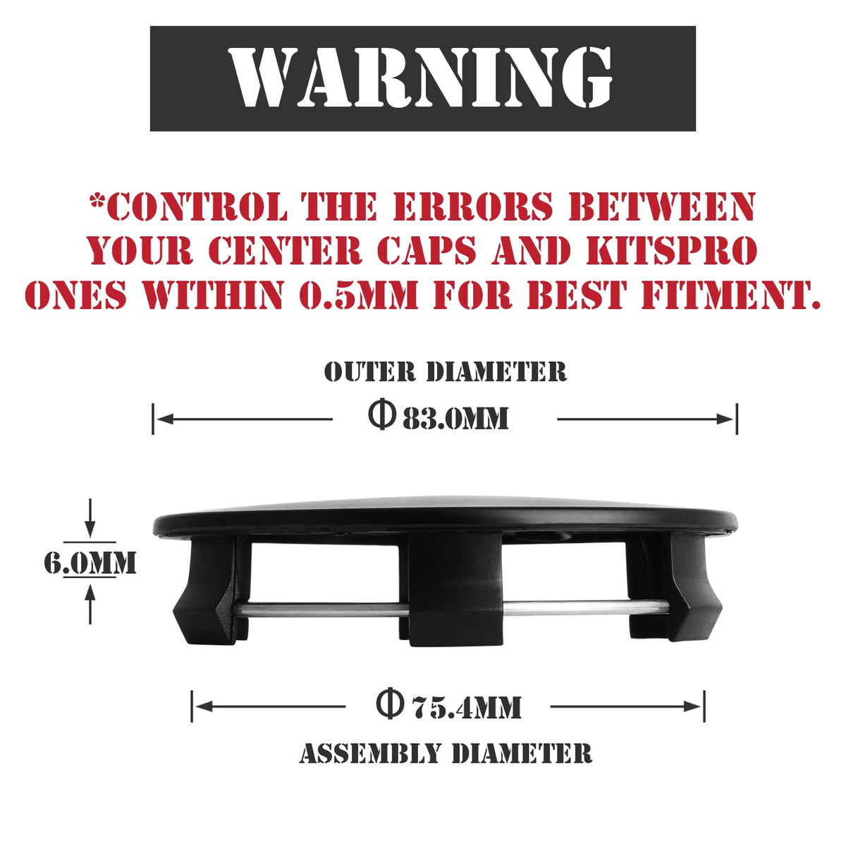 Kitspro Wheel Center Caps Are Designed To Replace The Old, Broken Or Missing Caps With Easy Installation. All Wheel Center Caps Are Made Of Heat And Impact Resistant Materials Which Have Been Tested To Insure A Secure And Reinforced Fitment. Each Set Contains 4 Pieces Of Wheel Center Caps. Please Make Sure That The Size Of The Wheel Center Caps Match Yours. ||Product Parameter: 1).Outer Diameter: 3.3 Inch 83Mm; 2).Assembly Diameter: 3.0 Inch 75Mm; 3).Length Of Clip: 0.2 Inch 6Mm.