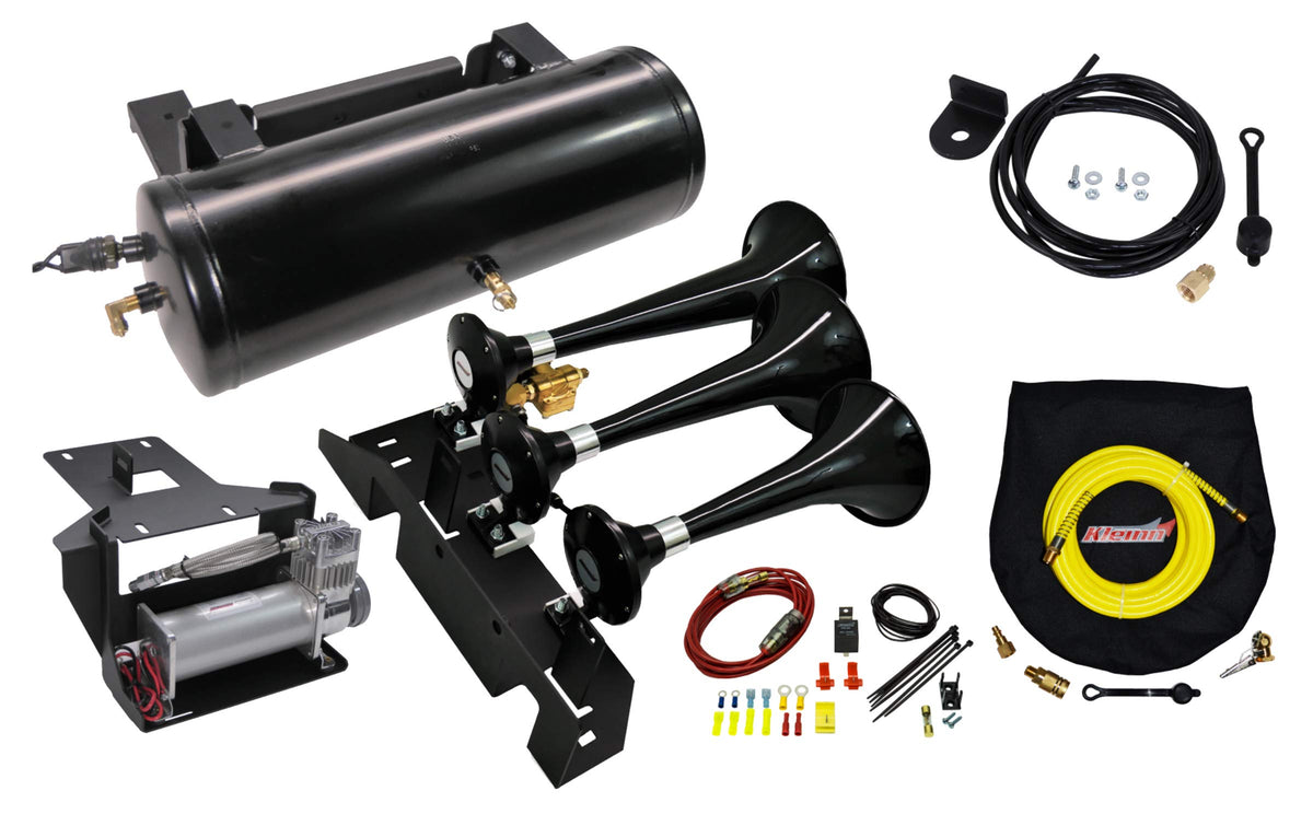 The Tun-230 Direct Fit Onboard Air System With Model 230 Train Horn Is 100% Bolt-On And Features A Heavy-Duty Kleinn Waterproof Air Compressor And 3-Gallon Air Tank Mounted On A Custom Made In The Usa Mounting Bracket. Using Basic Hand Tools, Anyone Can Install Their Own Onboard Air System – All Without Drilling A Single Hole! Includes A Quick Connect Tire Inflator With Locking Air Chuck, Remote Mount And Storage Bag. Everything Needed Comes In One Box For A Professional & Flawless Installation. Kleinn Vehicle Specific Train Horn Kits Are Also Available As A Stand Alone Onboard Air System Without A Horn. The Kit Can Be Upgraded With The P/N 6885 Ultra Blast Master Valve Upgrade To Make The Horns Even Louder!