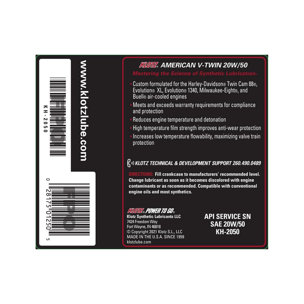Klotz 20W/50 Synthetic Motor Oil Change Kit for Twin Cam 1999-2018 & Milwaukee-Eight 2017-2024 (5-Quart Premium Kit)