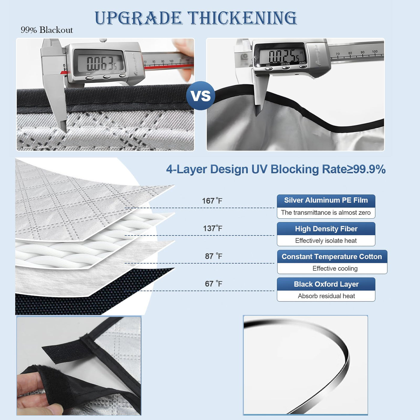 Q: What materials are used in the construction of the sun shade?A: The sun shade features a combination of upgraded diamond-patterned thickened insulation cotton and 310T reflective polyester, providing maximum durability, insulation, and UV protection.