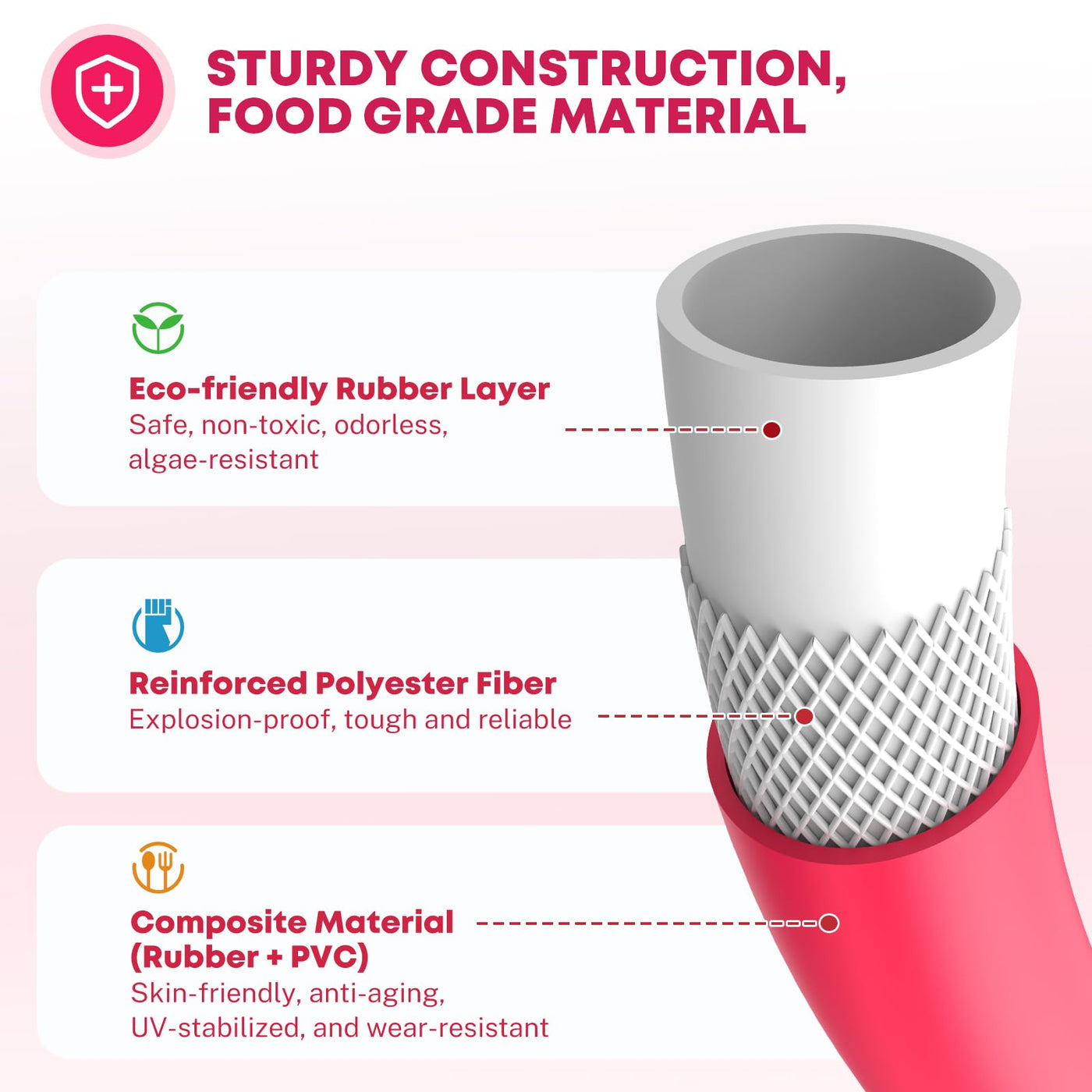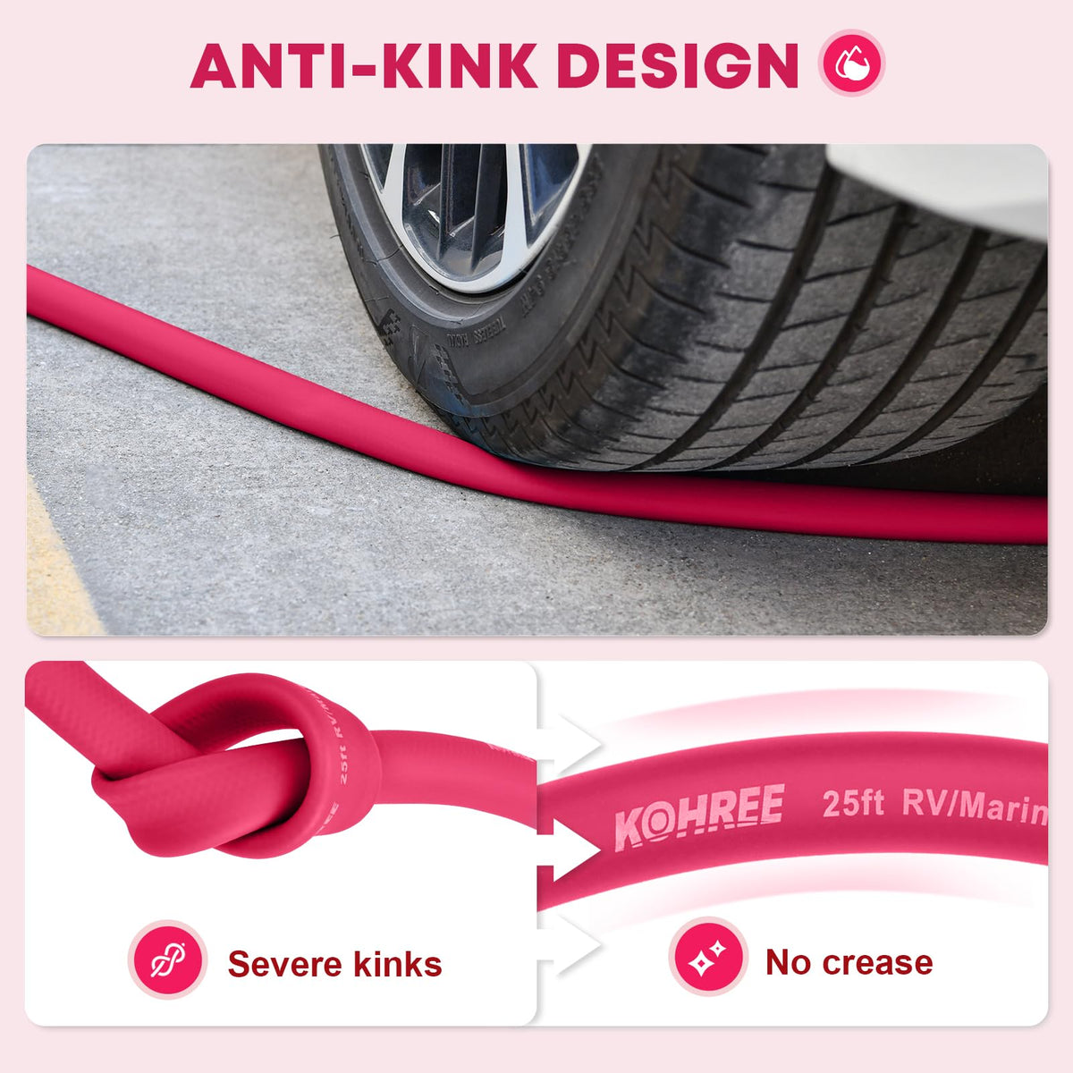 Kohree 25FT RV Water Hose, 5/8'' Premium Drinking Water Hose Leak Free, No Kink and Flexible Garden Hose with Storage Bag, Ideal for RV, Camper, Garden, Truck, Car - Pink