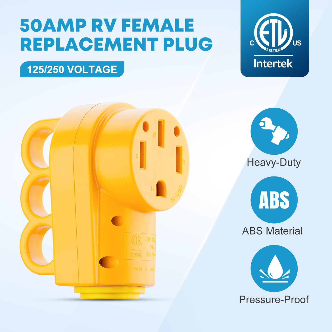Product description Size:50 Amp Female Plug Easy Hooking Up! Design of an inner strain relief clip and outer bushing, easily customized for the RV cord, it's able to shield from dust and debris to some extent, which also contributes to secure the cord for stable and good connection. Rated at 125V 50A, with ergonomic grip handle on the back, it's easy to plug in and unplug, better energy saving. Perfect for your RV, Camper, Caravan, Motorhome, Trailer or other vehicles. Money Saving, Easily Replace the Old Plug It saves your money from replacing the entire supply cord and makes it easy to repair the issues that will eventually occur with the molded plug. Easy to disassemble the old unit and re-do the connection or tighten up the clamping on a female receptacle are real pluses. Like any add-on plug, it's not waterproof and you will need to keep it out of puddles and rain. Be sure to read the instructions first! It will save you a lot of frustration. Package Included: 1 x 50A RV Replacement Female Plug