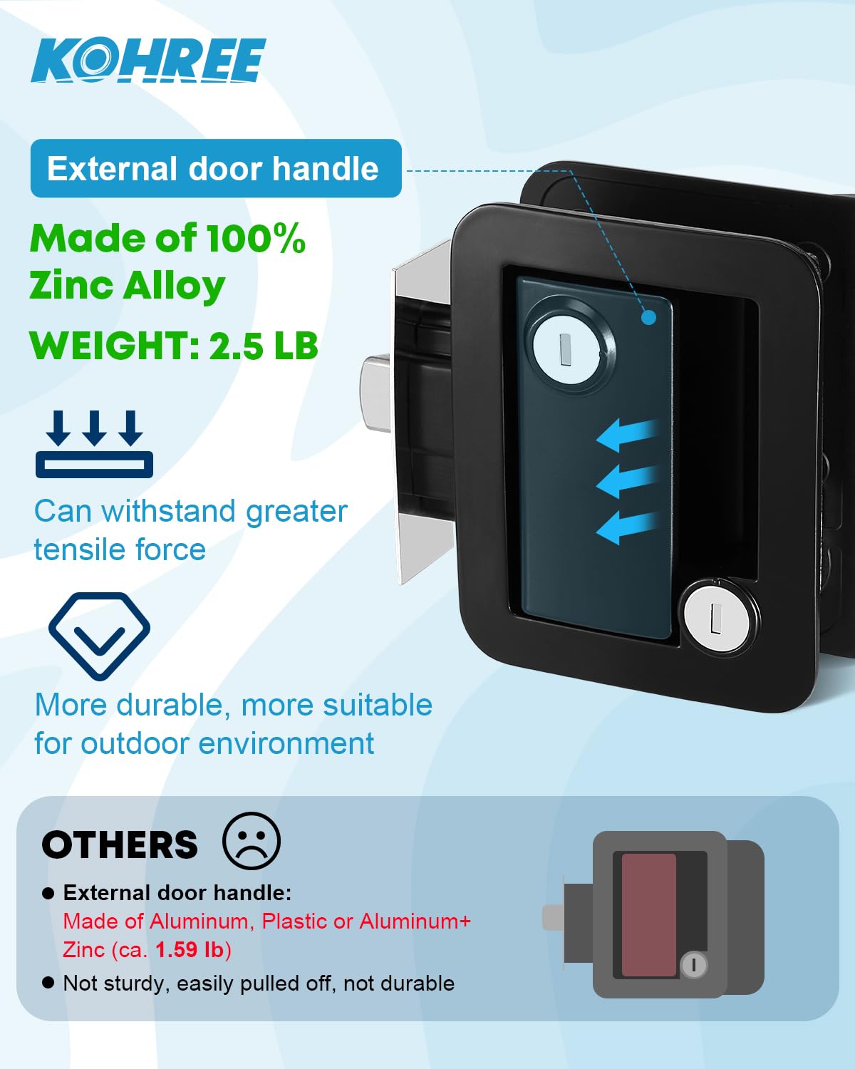 Q: What materials are used in the Kohree RV Door Lock?A: The Kohree RV Door Lock is made of high-quality 100% Zinc Alloy, which offers enhanced durability and resistance to wear. This material provides a robust construction that withstands various environmental conditions.