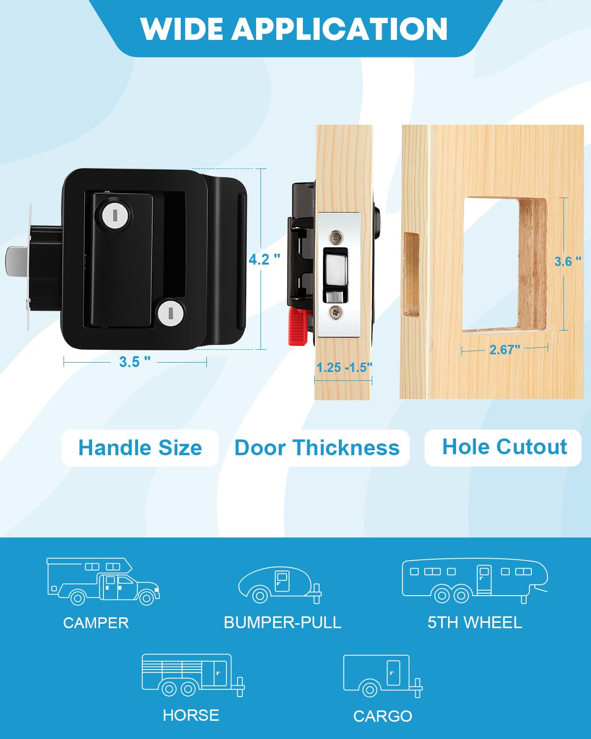 Q: Is the Kohree RV Door Lock compatible with all RV doors?A: The Kohree RV Door Lock fits most RV doors, with a hole cutout size of 2.67" x 3.6" and is suitable for door thicknesses ranging from 1.25" to 1.5". It's designed to be versatile for various travel trailers, campers, and cargo haulers.