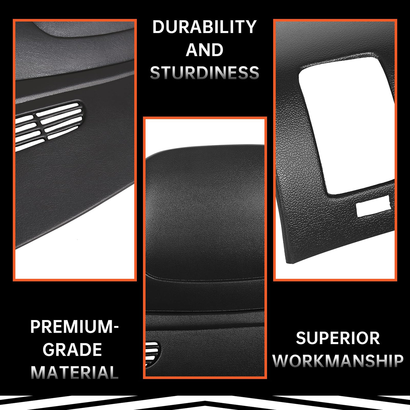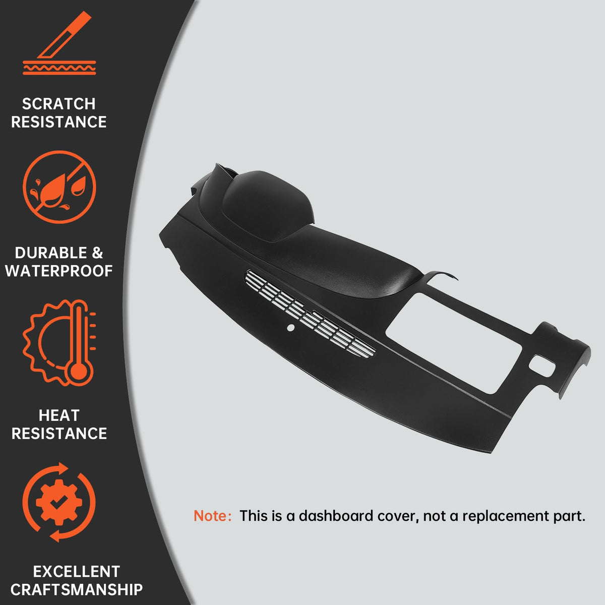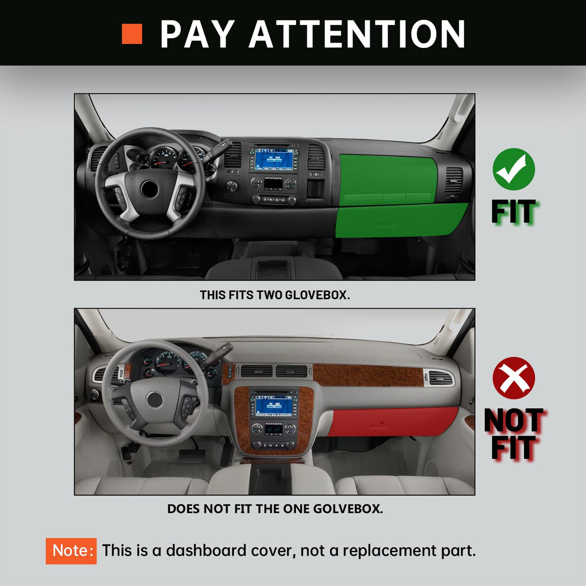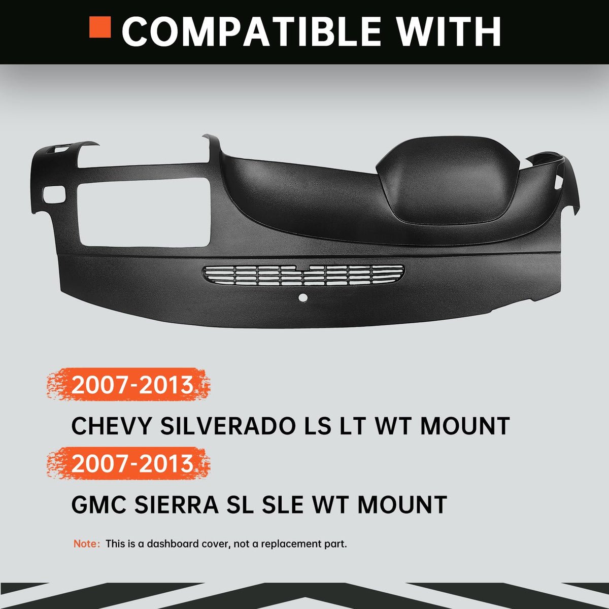 FITMENT - Compatible with 2007-2013 Chevy Silverado LS LT WT Mount, 2007-2013 GMC Sierra SL SLE WT Mount. NOTE: DUAL GLOVEBOX STYLE DASH ONLY! FEATURES - The black dash cover is a dash cover, not a replacement. Made of high quality plastic, durable, tough and impact resistant for long time use. Position on the vehicle: middle, front, upper. FUNCTIONAL - The dashboard cover can cover previously damaged parts and give your dashboard a new look. Protects previous dashboards from sun damage and scratches. PACKAGE - Includes 1 Dashboard Cover and Mounting Accessories. NOTE: Instruction manual not included. INSTALLATION - Before installation, please confirm whether the installation site is dry and clean, and keep most of the old dashboard cover as the installation base. After installation, you can use a heavy object to press properly for a period of time to ensure a firmer fit.