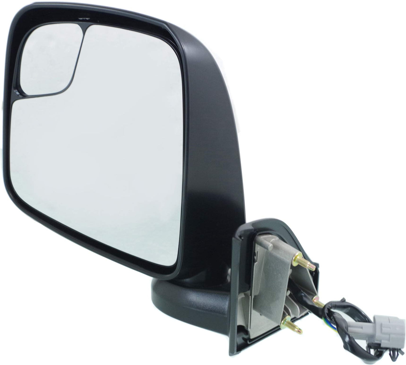 Q: What features does the Kool Vue Driver Side Mirror offer?A: This mirror features a textured black finish, manual folding capability, heating for defrosting, and includes blind spot glass for enhanced visibility. It also has power glass for easy adjustments.
