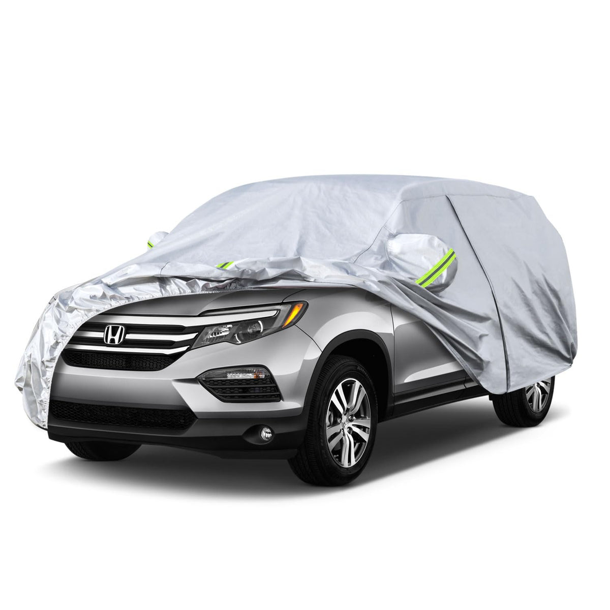 ?Suitable Model?--Suitable for Honda Pilot 2002-2025 ,accurate size measurement, perfect fit to the body, so that your shopping no longer worry about size. | ?Upgraded Material?--KouKou multi-layer covers adopt newest heavy duty and secure materials. It is 100% Waterproof, great for rainproof snowproof in winter. Highly reflective aluminum fabric is good at sunproof, anti-Uv and keeps cool in summer. The inner lining is soft cotton that would protect car paint better. | ?Product Details?--1. Driver side door zipper design 2. Windproof straps stop the cover blown away by heavy Wind 3. 6pc reflective stripes remind other people at night 4.Mirror pockets make the cover more suitable and easy to put on 5.Come with a waterproof bag you can easily fold the cover and carry it with you in the trunk. | ?Extreme Weather Protection?--KouKou thick weatherproof car covers provide overall protection of vehicle from all-weather elements: dust, snow, industrial pollution, bird droppings, leaves, pollens, acid rain and etc. | ?Warm Reminder?--KouKou provides a 12-month service, beyond the normal service period. If you have any questions, please feel free to contact us, we will try our best to solve in the first time, let you buy comfortable, with rest assured.