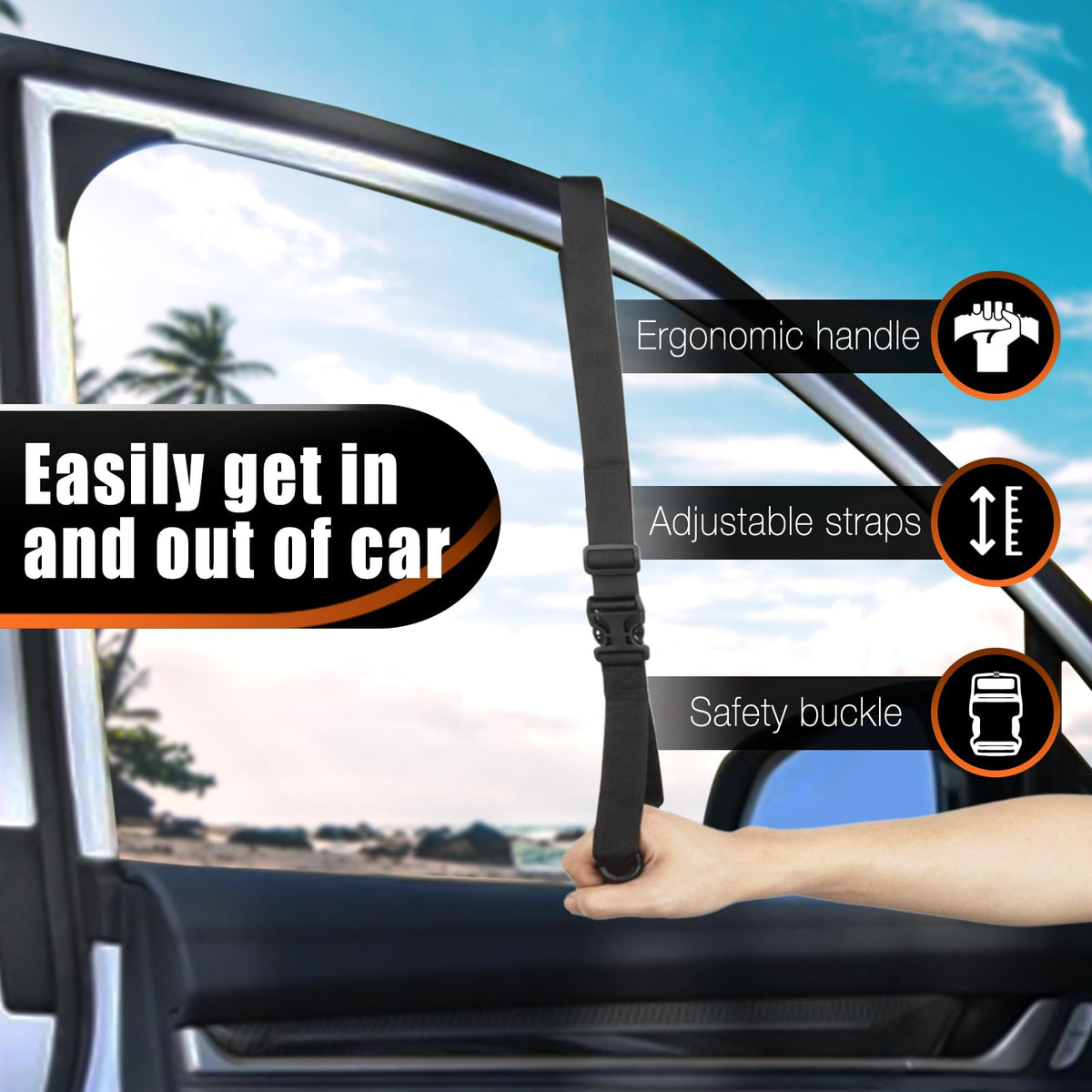 Q: How does the multifunctional design of this car handle assist work?A: The KOUNATSURI Car Handle Assist not only aids in entering and exiting the car but also features a seatbelt cutter and a window breaker for emergencies, providing added security and convenience.