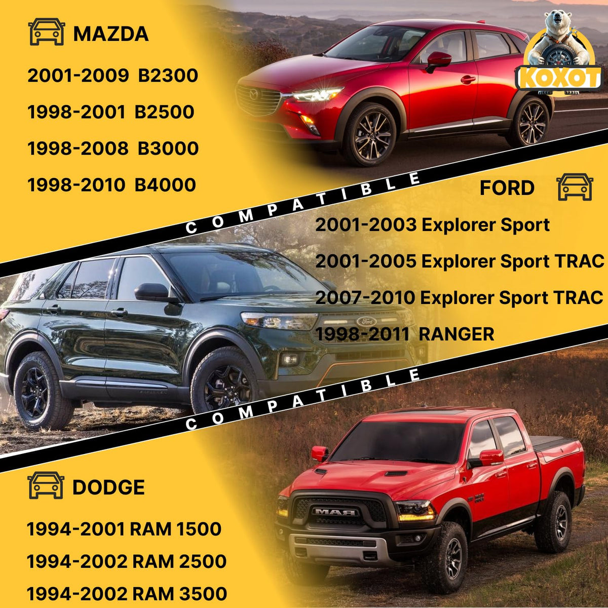 About Koxot: As an outstanding brand in automotive accessories, Koxot has been specializing in producing and selling automotive balance bars and control arms since its establishment in 1998. With its exquisite craftsmanship, excellent quality, and innovative design, Koxot has quickly emerged and become the trusted choice of many car owners and auto repair shops. Product Fitment Information: Compatible With The Following Vehicle Position:Front Compatible With Dodge 1994-2001 RAM 1500 1994-2002 RAM 2500 1994-2002 RAM 3500 ================ Compatible With Ford 1995-2010 Explorer 2001-2003 Explorer Sport 2007-2010 Explorer Sport Trac 2001-2005 Explorer Sport Trac 1998-2011 Ranger ================ Compatible With Mazda 2001-2009 B2300 1998-2001 B2500 1998-2008 B3000 1998-2010 B4000 ================ Compatible With Mercury 1997-2010 Mountaineer ================ Package Includes: 2 x Front Stabilizer Bar End Link - K7275 Product Advantages 1. Advanced Manufacturing Process Koxot adopts advanced forging and casting technologies to ensure the strength and durability of the stabilizer bars and control arms. Precision processing equipment guarantees the dimensional accuracy and surface quality of the products, enabling them to perfectly fit various vehicle models. 2. High-quality Material Selection High-strength alloy materials are selected, which have excellent fatigue resistance and corrosion resistance. Raw material suppliers are strictly screened to ensure that each batch of materials meets high-quality standards. 3. Strict Quality Inspection Each product undergoes multiple strict quality inspection procedures, including mechanical performance tests, fatigue tests, and dimensional inspections, etc. Only products that pass all tests can enter the market for sale, providing customers with reliable quality assurance. 4. Innovative Design The R & D team continuously explores and innovates, optimizes the product structure and design, and improves the performance of the stabilizer bars and control arms. Combined with market demands and the development trends of automotive technology, products that meet the requirements of the latest vehicles are launched. Service and Support Koxot not only offers high-quality products but also is dedicated to providing customers with all-round service and support. We have a professional technical team that is capable of offering technical guidance for product installation and debugging to customers. Meanwhile, we have established a perfect after-sales service system, responding promptly to customers ' inquiries and complaints, providing customers with a two-year warranty and leaving them with no worries.