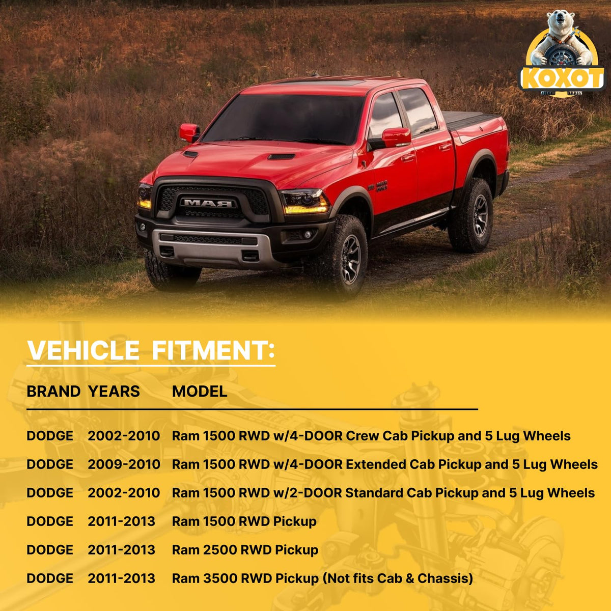About Koxot: As an outstanding brand in automotive accessories, Koxot has been specializing in producing and selling automotive balance bars and control arms since its establishment in 1998. With its exquisite craftsmanship, excellent quality, and innovative design, Koxot has quickly emerged and become the trusted choice of many car owners and auto repair shops. Product Fitment Information: Compatible With The Following Vehicle Compatible With Dodge 2002-2010 Ram 1500 RWD w/4-DOOR Crew Cab Pickup and 5 Lug Wheels 2009-2010 Ram 1500 RWD w/4-DOOR Extended Cab Pickup and 5 Lug Wheels 2002-2010 Ram 1500 RWD w/2-DOOR Standard Cab Pickup and 5 Lug Wheels 2011-2013 Ram 1500 RWD Pickup 2011-2013 Ram 2500 RWD Pickup 2011-2013 Ram 3500 RWD Pickup (Not fits Cab & Chassis) ================ Package Includes: 2 x Front Stabilizer Bar End Link - K7400 Product Advantages 1. Advanced Manufacturing Process Koxot adopts advanced forging and casting technologies to ensure the strength and durability of the stabilizer bars and control arms. Precision processing equipment guarantees the dimensional accuracy and surface quality of the products, enabling them to perfectly fit various vehicle models. 2. High-quality Material Selection High-strength alloy materials are selected, which have excellent fatigue resistance and corrosion resistance. Raw material suppliers are strictly screened to ensure that each batch of materials meets high-quality standards. 3. Strict Quality Inspection Each product undergoes multiple strict quality inspection procedures, including mechanical performance tests, fatigue tests, and dimensional inspections, etc. Only products that pass all tests can enter the market for sale, providing customers with reliable quality assurance. 4. Innovative Design The R & D team continuously explores and innovates, optimizes the product structure and design, and improves the performance of the stabilizer bars and control arms. Combined with market demands and the development trends of automotive technology, products that meet the requirements of the latest vehicles are launched. Service and Support Koxot not only offers high-quality products but also is dedicated to providing customers with all-round service and support. We have a professional technical team that is capable of offering technical guidance for product installation and debugging to customers. Meanwhile, we have established a perfect after-sales service system, responding promptly to customers ' inquiries and complaints, providing customers with a two-year warranty and leaving them with no worries.