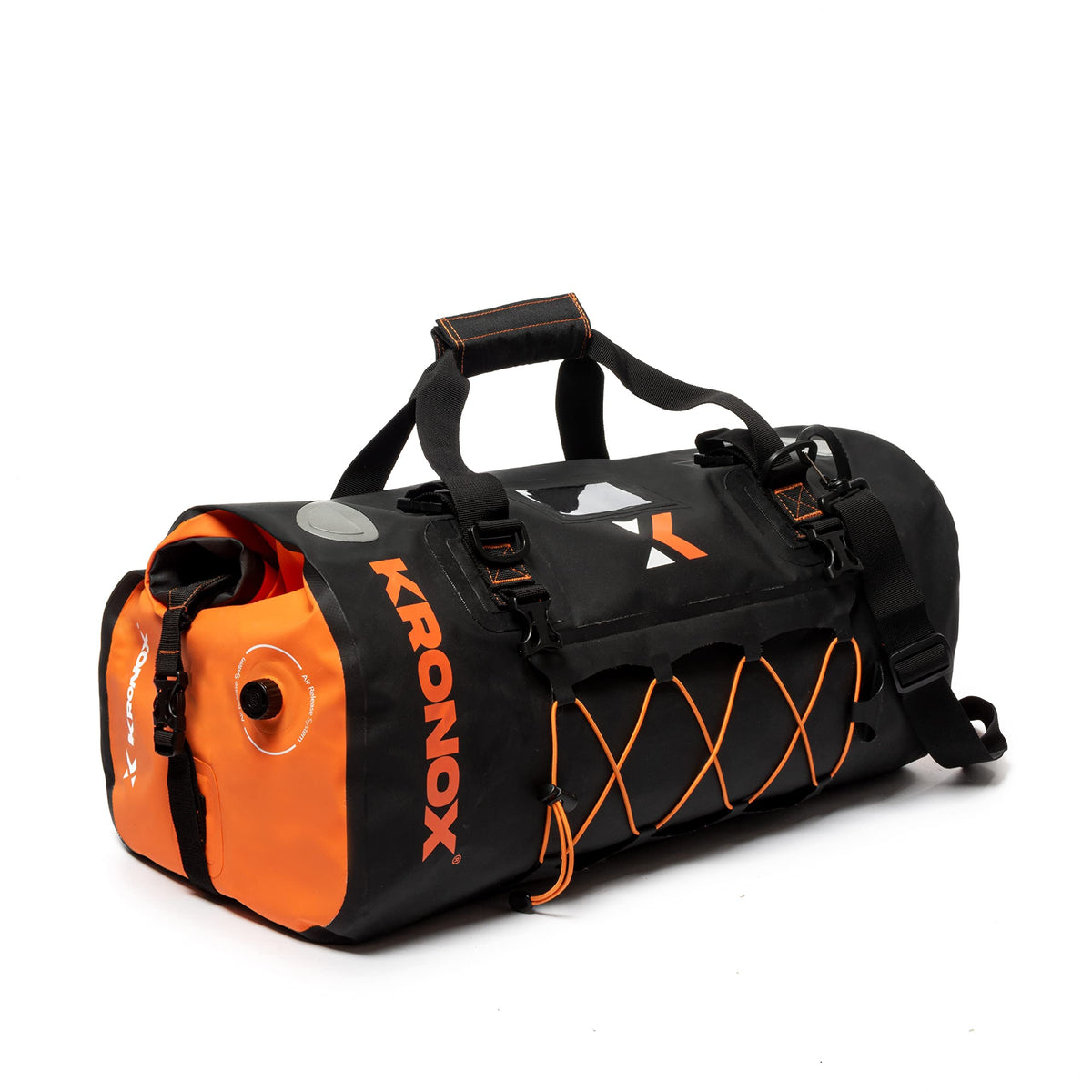 Kronox Waterproof Duffle Bag For Motorcycle Back Seat - Black & Orange, Vinyl, Hook And Loop Closure, 40-60 Liters Capacity, Ultimate Gear For Riders