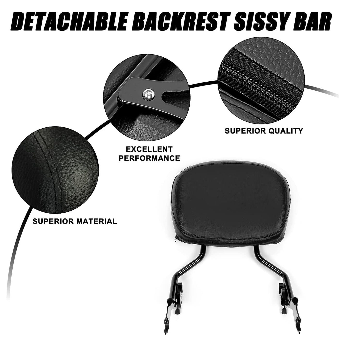 Vehicle Compatibility: Our Backrest Sissy Bar is compatible with 09-Later Touring Models Equipped with Required Docking Hardware Kits; Compatible with 09-Later Touring Models Equipped with Rigid-Mount Tour-Pak Luggage Require Purchase of Appropriate H-D Detachables Tour-Pak Conversion Kit. Please confirm the fitment of the product before purchasing. Product Parameters: 18.6 inches high from the rear docking point to the top of the pad. Black faux leather backrest: 10.63''(H) x 13.78''(W). Premium Quality: This sissy bar is made of high-strength steel, providing higher strength and longer lifespan. The all-black finish adds a distinctive appearance to your vehicle. And the backrest is made of faux leather, which is easy to clean and maintain. Installation Method: No installation instructions available. You will receive 1 x Black Detachable Backrest Sissy Bar. When installing, place the front point of the sissy bar at SHOCK POINT and place the rear point of the sissy bar at DOCKING POINT. Requires separate purchase of 4-Point P/N (54205-09 ) or 2-Point P/N (54030-09) Docking Hardware Kits. Important Notice: Not compatible with Trike, 2009+ Cvo Models with Rigid Mount Tour-Pak & 2014 Touring Models with Rigid Mount Tour-Pak. Not Compatible with 2009-2013 Flhtc, Flhtcu, Flhtk , Fltru & Models equipped with previous equipment rigid mount Tour-Pak require detachable Tour-Pak Rack Kit.