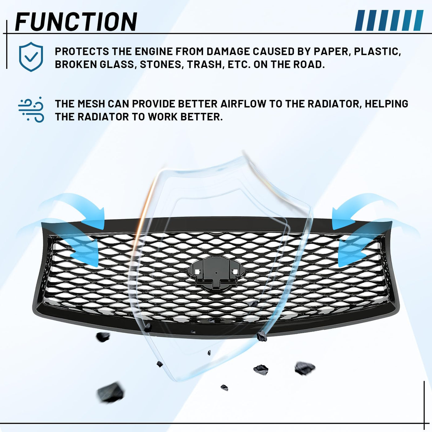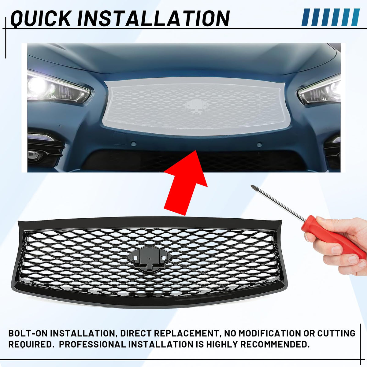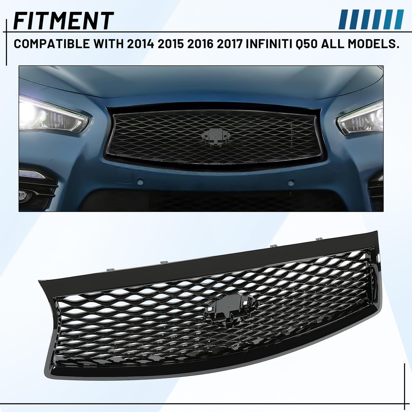 FITMENT: Compatible with 2014 2015 2016 2017 Infiniti Q50 All Models. UPGRADED APPEARANCE: Made of ABS plastic with painted black exterior, which can withstand harsh weather conditions while upgrading the appearance of your vehicle. FUNCTION: Protects the engine from damage caused by paper, plastic, broken glass, stones, trash, etc. on the road. The mesh can provide better airflow to the radiator, helping the radiator to work better. QUICK INSTALLATION: Bolt-on installation, direct replacement, no modification or cutting required. Professional installation is highly recommended. PACKAGE LIST: Including 1 X Grille(Emblems are not included). Includes mounting hardware, but does not include instructions.