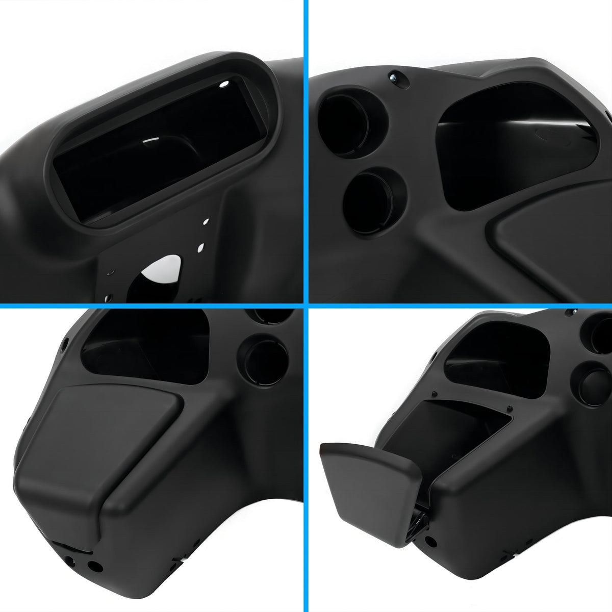 Product Compatibility: This fairing is compatible with 1998-2013 Harley Davidson Road Glide CVO FLTR. Upgrade your motorcycle with front inner and outer headlight fairings. Superior Material: Made of sturdy plastic for superior durability and strength. Effectively protect your headlights and add a touch of style to your motorcycle. The front inner and outer headlight fairings are designed for the demands of the road. Convenient Storage: The fairing comes with two tool boxes on each side, providing a practical storage solution for your riding essentials. Make sure your tools, gadgets or personal belongings are easily accessible while on the road. Stylish Look: Matte black finish makes a statement, this stylish color choice adds a touch of sophistication to your motorcycle. Whether you're cruising during the day or riding under the night sky, this fairing will help you stand out in traffic. Easy Installation: The fairing comes with pre-drilled holes to ensure a smooth installation process. Instructions not included. The kit includes all the necessary hardware so you can quickly and safely install the inner and outer fairings.