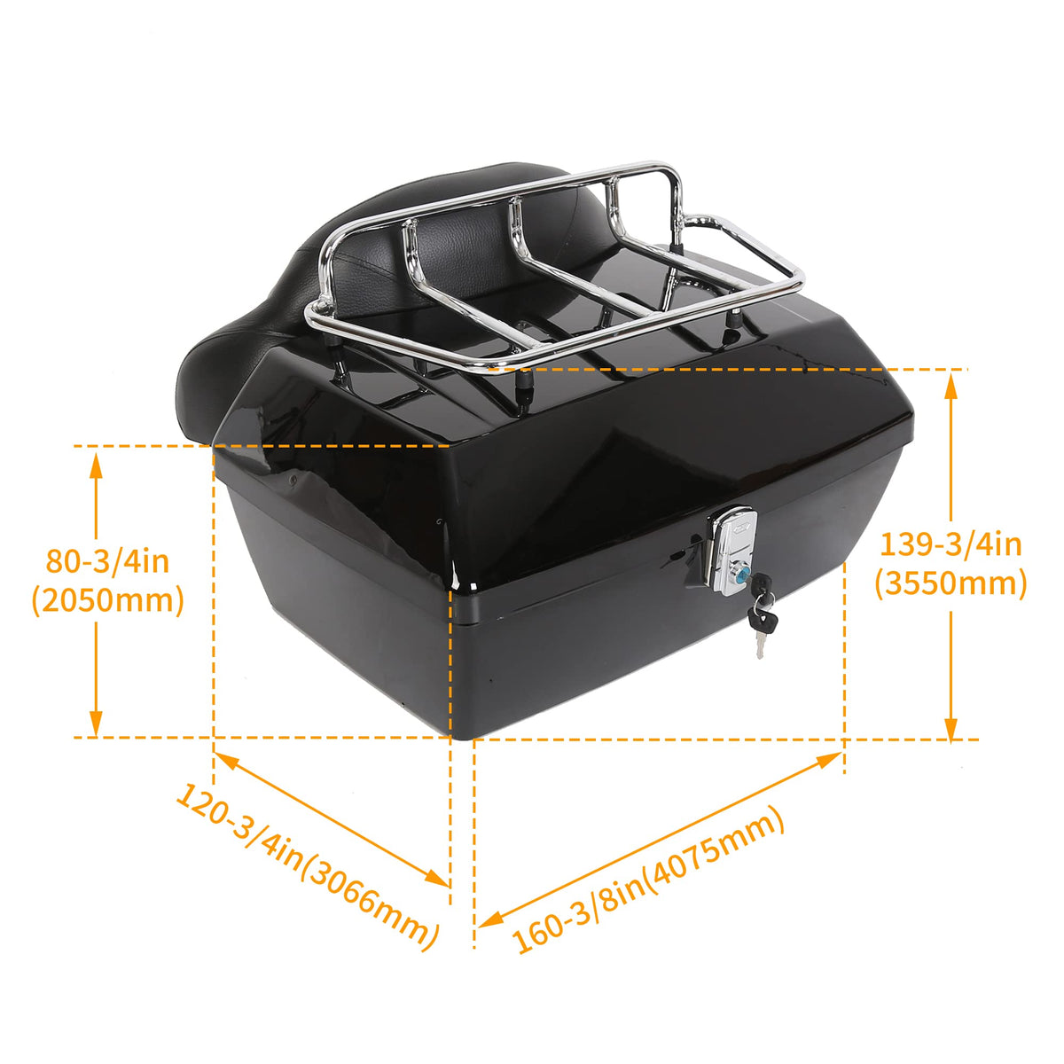 Description Made Of High Quality Abs, Similar To The Harley Part, Comes With A Very Nice Molded, Upholstered Backrest And A Functional Steel Top Rack. Comes With Assembly Instruction, Not Installation Instruction. Larger Enough For 1 Full Face Helmet. Requires 8 X 8' Luggage Rack Or Flat Supportive Base To Install. Top Rack Dimension: 18' L X 9' W X 1.5' H. Inner Dimension: 21' L X 14 1/2' W X 10' H. Outer Dimension: 22' L X 15 1/2' W X 11' H. Package Includes: Top Rack(Drilling Required For Assembly) & Dual Cushion Backrest & Lock Set (2 Keys, Lock) & Hardware (Screw, Nuts, Washers).