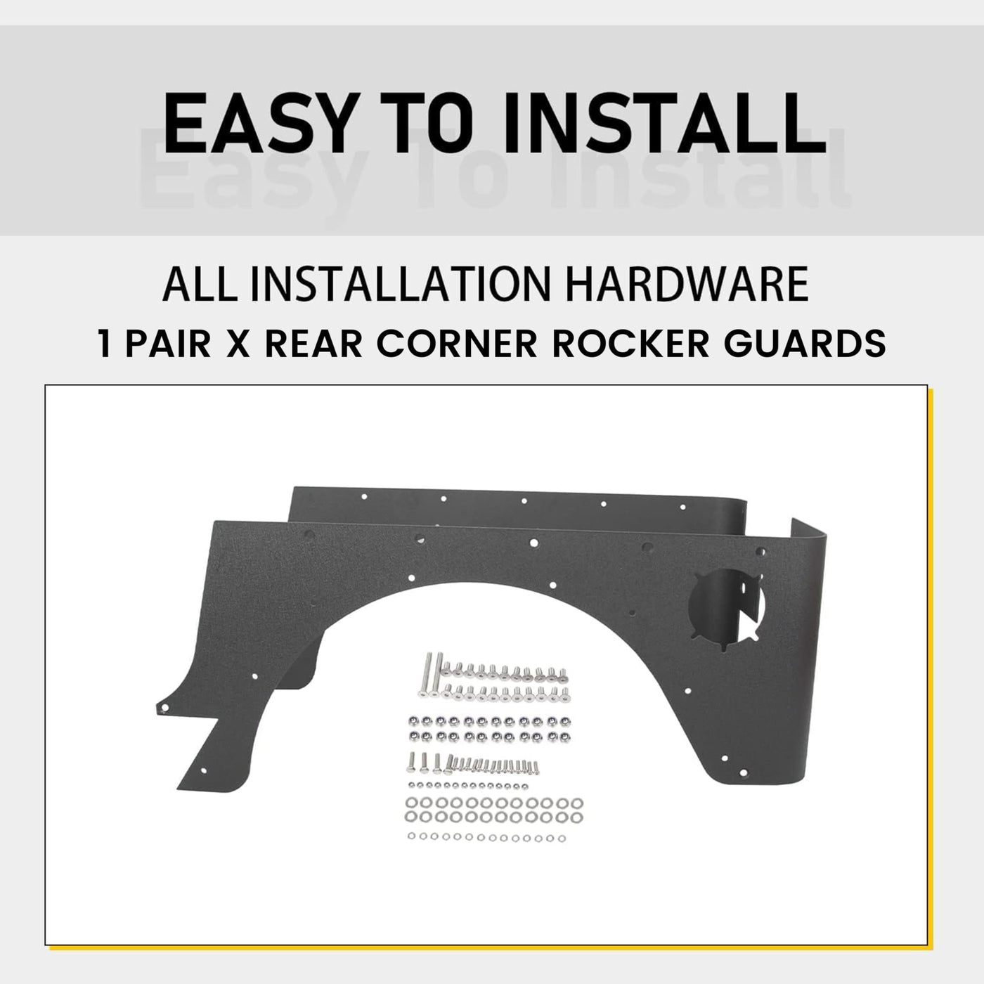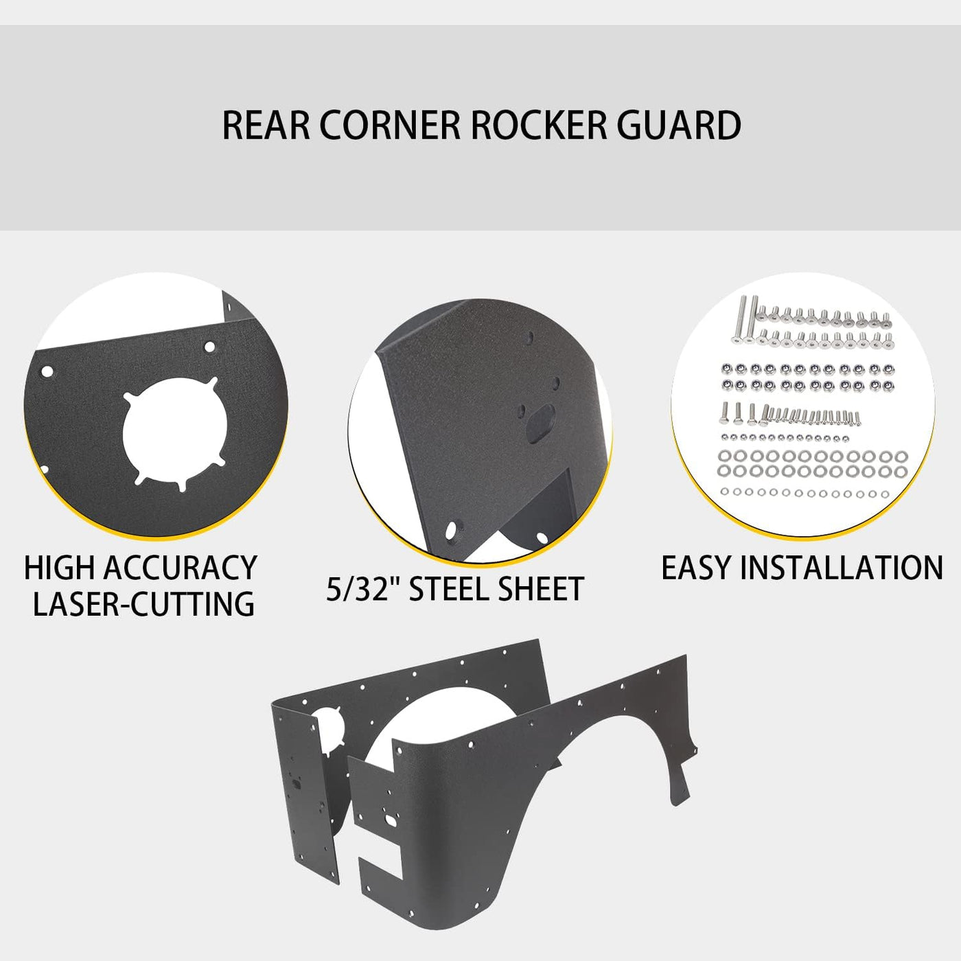 Compatibility - Rear corner rocker guard compatible with 1997-2006 Jeep Wrangler TJ. Durable Construction - Rear corner rocker guard is made from durable 5/32'' steel sheet with toughness and durability. Black Textured Powder Coat Finish,ensures long-term outdoor use without rust. Installation - Easy and straight forward installation but do require some drilling into the body panels for proper installation.The wheel opening is large enough to allow maximum tire and articulated clearance. Premium Design- The design combines stylish with efficiency, well decorates the appearance, protects the rear of the vehicle from rock damage and scratches. Align greatly with the body lines of the vehicle,enables it to go around the vehicle's flares. Package Contents: 1 X Rear Corner Rocker Guard. Installation hardware is included.