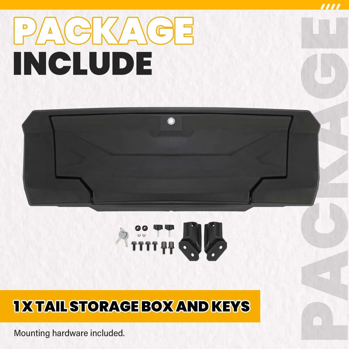 Product Applicability: Tail Storage Box Compatible with 2021,2023 Kawasaki Teryx KRX 1000 eS; 2020 Kawasaki Teryx KRX 1000 Accy Pkg ; 2020-2023 Kawasaki Teryx KRX 1000; 2021-2023 Kawasaki Teryx KRX 1000 Special Edition/Trail Edition; 2023 Kawasaki Teryx KRX4 1000 SE/eS/eS Special Edition. Direct Replacement: Replace for part number 99994-1320. The storage box is designed to be a cargo box for the back end of your UTV, and you can simply replace boxes that have been damaged or deteriorated. Overall Design: The storage box has a convenient lid that opens fully for easy access to gear. The sturdy PE plastic construction contributes to the tail box's high strength use. The exterior is equipped with a latch to provide secure storage. Adequate Storage Space: This storage box adds sealed storage space to the cargo bed of your UTV. It can be used to transport tools, equipment, cargo, food, tie downs, emergency kits and more, protecting stored items from the weather. Easy Installation: Instructions are not included. Only 1 x tail storage box and keys, mounting hardware included. Suitable for the rear cargo area of UTVs and can be attached directly to the cargo rack.