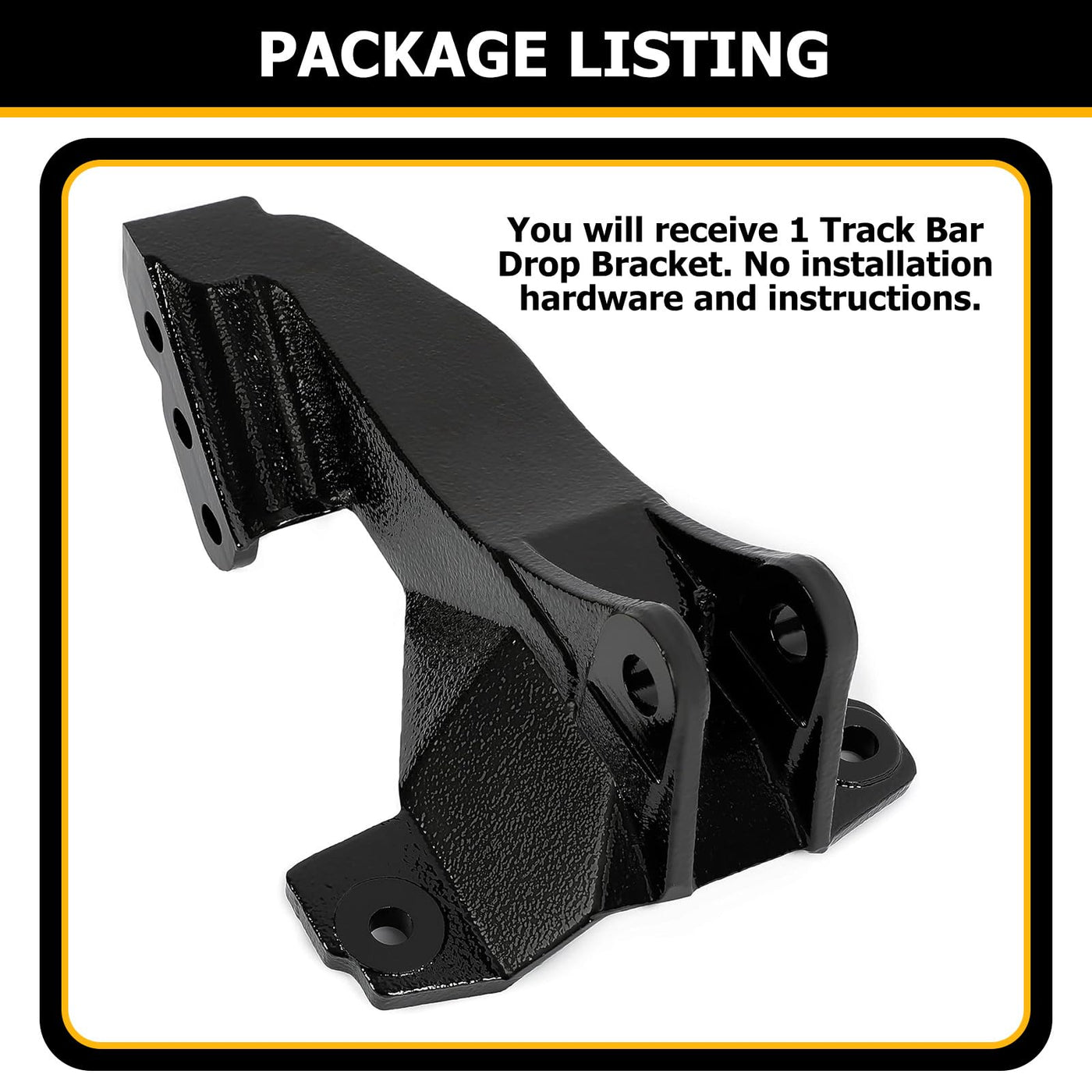 Compatibility: Compatible with 2008-2022 Ford F250/ F350 4WD Super Duty; Compatible with 2008-2010 Ford F250/ F350 4WD; Compatible with 2011-2016 Ford F450 4WD Super Duty. Features: Made of high-quality steel, strong, durable, high hardness, impact resistance, excellent performance, durable. The black powder coating on the surface can effectively isolate air moisture and prevent rust. Function: Helps eliminate steering or tracking problems that may have been caused by previous lift kits, improving vehicle performance and safety while driving. Installation: Track Bar Drop Bracket is installed by screws. In order to ensure the correctness of the installation, professional installation is strongly recommended. Package: You will receive 1 Track Bar Drop Bracket. No installation hardware and instructions