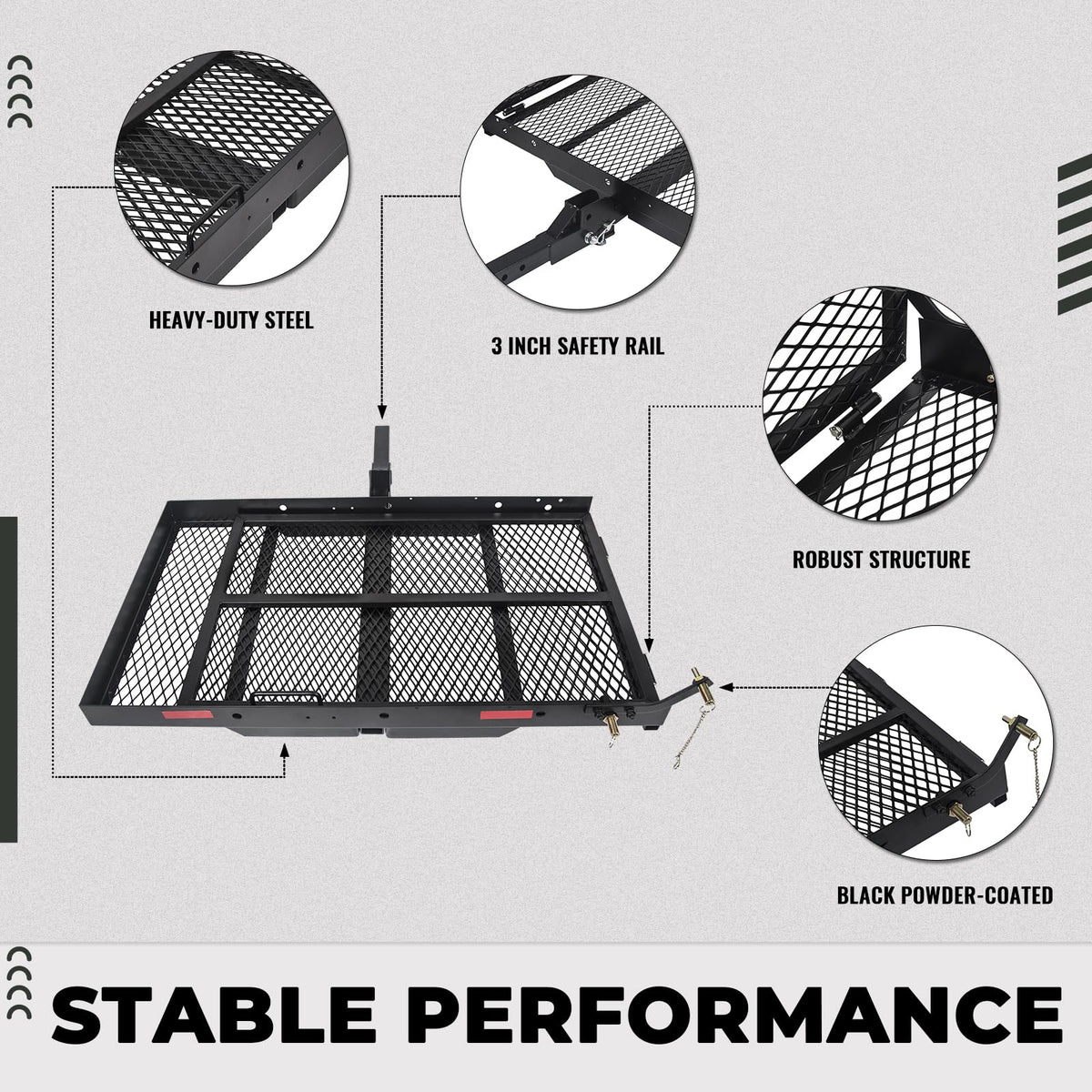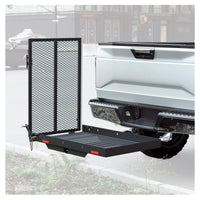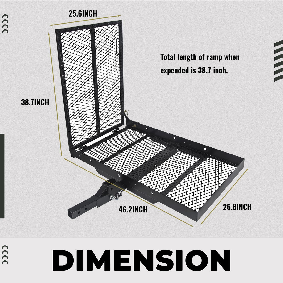 Durable black powder coated finish,heavy duty steel construction. It can be used as a carrier and a ramp; simply attach it to your hitch. Provides instant cargo space when your car is out of space. Folding ramp can also be locked flat when not in use. 3-position carrier (closed flat, open L-shape & open flat.Tie down straps can be hooked onto any of the tie down holes featured on the ramp sides. Handle on the ramp for easy folding and unfolding. Fits All 2'' Receiver, Hitch Class III Or IV. Has a 3 inch safety rail. Highly recommended for heavy duty cargo like generator to fix in the middle position. Weight Capacity of Ramp: Up to 500 lbs.Total length of ramp when expended is 38.7 inch. Total weight of carrier 75 Lbs; Weight of ramp (gate) 16 lbs. Never exceed the rated capacities of your hitch. Hitch tightener is required to prevent the rack from wobbling,anti wobble plate is not included.