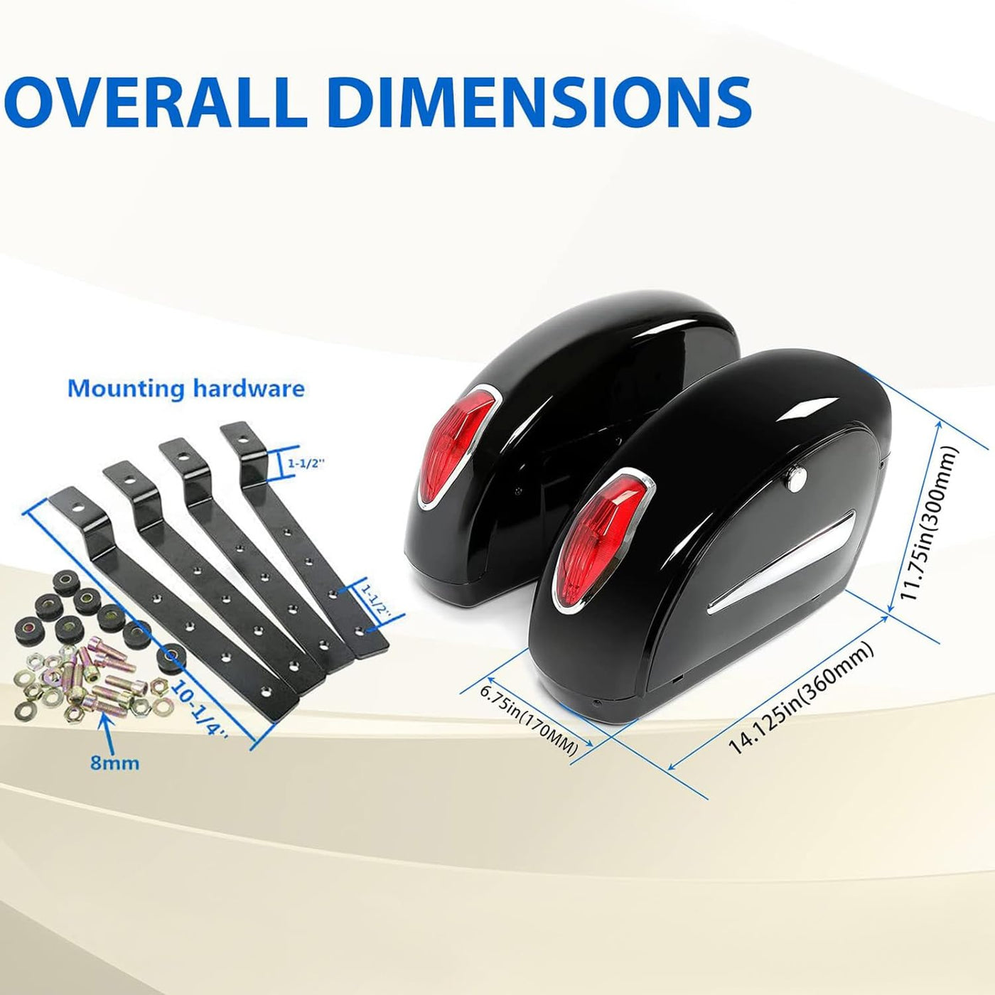 Black Hard Saddlebags Are Compatible With Most Of The Motorcycles. Please Examine The Brackets And Overall Dimensions Of Your Motorcycle To Make Sure They Are Fitable. The Material Is High Quality Abs Plastic, With Beautiful Glossy Finish All Over The Case. Solid Enough, Come With Locks, Bring A Sense Of Security. Dimension: 14.125' Length X 11.75' Height X 6.75' Width. (Outside Dimension Measurements). Package Include: 1 Pair Of Saddlebags And Necessary Mounting Hardware. Notice: The Key Is Attached To The Box With Tape, Please Examine The Package Carefully.